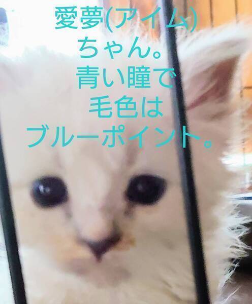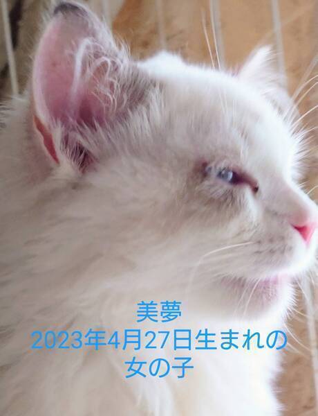 | 特徴(性格など) | 変更箇所:茶夢(ちゃーむ)、募集終了です。 その他の変更箇所: この「いつでも里親募集中」でウチから2匹子猫をもらってくださった里親さんが、その猫達の動画をTikTokに載せてくださっていますので、里親さんの許可を得たうえで、そのURLをこのページの一番下に載せました。ウチの子猫達が成長するとどんな感じになるのかおわかりいただけると思います。TikTokのアカウント名は、「らいすとおもち」。らいすちゃんの「いつ里」での旧名は来夢(らいむ)、おもちちゃんの旧名は愛夢(あいむ)です。らいすちゃんは2023年4月生まれで、おもちちゃんは2023年5月生まれ。2023年12月にそれぞれ生後8か月と7カ月になります。顔がラグドール風のらいすちゃんは美しく、顔がサイベリアン・ネヴァ・マスカレードとミヌエットのミックス風のおもちちゃんは愛らしく成長しました。是非ご覧ください。ウチの猫達は基本的に大人になって個性が出始めてから魅力が増すタイプの容姿です。 2023年4月27日生まれの女の子「美夢(みいむ)」、譲渡再開です。かかりつけの獣医さんによると、頭のたんこぶは悪性腫瘍ではなく、小さな頃にプロレスごっこで怪我した箇所が化膿して固まり、盛り上がっているだけだそうです。 美夢(みいむ):写真1枚目~3枚目(2023年10月17日撮影)及び写真5枚目。青い瞳の長毛ブルーポイントバイカラー。西洋型の目がクリクリしたかわい子ちゃんタイプではなく、和風の清楚で上品なタイプ。昔の女優さんにたとえれば、和服の夏目雅子タイプ。美夢は、性格も容姿も、ほっそりしてちょっと儚げ。 5種ワクチンがメーカー側の都合により、クラジミア対応ワクチンが減って、4種ワクチンに変更になりました。4種ワクチンの価格は、残念ながら、5種ワクチンと同じ5950円です。 (前回までの変更箇所): 来夢、愛夢、飛夢、空夢、明夢の里親さんが決定しました。皆、里親さんがそれぞれ違うので、この募集ページで募集状況を「募集終了」や「里親さん決定」に変更してしまうと、この募集ページで残りの子の里親さんを募集できなくなります。なので、里親さんが決まった猫のそれぞれの募集要項ページを新たに作成して、作成したそれぞれの募集要項ページでその子の募集状況を「里親さん決定」に変更いたします。 参考:ラグドールやサイベリアンの世界では、灰色をブルー(青)と表現しています。ポイントは手足の先(ポイント)などが白いこと。通常バイカラー(2色)は、鼻筋が白い「八割れの顔」を指します。 参考:ウチのブルーポイントの子達は、「銀のスプーン三ツ星グルメ」のパッケージのラグドール(シールポイント・バイカラー)よりも、かなり薄めの色。シールは焦げ茶色。 *一度ご応募くださって落とされた方は、再応募をご遠慮くださいませ。それなりの理由があって落とさせていただいています。例:「ご家族が猫の飼育に非協力的」、「里親申込書に「猫のためにお金を貯めた」と記載なさっているのに、譲渡費用を支払う段階になって3万5千円のお金がなく、支払いを数週間待ってほしいと書いていらっしゃった」などなど・・・・特に来夢は絶大な人気がありますが、譲渡決定後に「お姑さんが外飼いを主張」「今は譲渡費用がない」「ペット可マンションだが飼育可能は1匹までだった」などの理由で、何回もキャンセルになっています。さすがに来夢が可哀そうです。 *食費その他を2万円から3万円に変更。 *お届け可能地域に大阪と奈良、京都、広島、山口を追加。(奈良には以前、お届け済み)。お届けは高知から日帰りできる地域に限られているので東京・神奈川は基本的に対応していませんが、猫お届け時の行きは特急と新幹線で(「いつでも里親募集中」では飛行機での猫の運搬をお勧めしていません)、お届け後の帰りは飛行機で、お届けして日帰りできる場合は、東京・神奈川の場所によっては対応できることもあります。元の飼い主(募集者の私)が一緒にいた方が里親さん宅でいろいろ安心して覚えられるので、通常お届け時に里親さん宅で元の飼い主が猫トイレの躾や良く使う場所を教えます。里親さん宅に最短30分から最長2時間お邪魔して帰ります。お茶その他要らないです。 *必ず猫好きの猫「2匹以上」でお飼いください。「猫1匹と小鳥1羽」、「猫1匹とウサギ1匹」、「猫1匹と犬1匹」ではお譲りしていません。ウチの猫は多頭飼いで育っているため、1匹だと寂しがります。今までの里親さん宅でも、猫好きの先住猫さんから片時も離れず、一緒に遊び一緒に眠っています。 ウチに前にいた猫達も多頭飼いだったのですが、皆15歳を過ぎる頃から1匹1匹と死んでいき、最後に残った一匹はとても寂しかったらしく、最後の1匹になった途端、猫毛と人間の髪の毛はかなり違うのに、毎晩私の髪に顔をこすりつけて眠るようになりました。 また、ウチの猫は猫同士のプロレスごっこも大好きなので、特に小鳥やウサギは、この猫のプロレスごっこで命を落とす可能性があり
