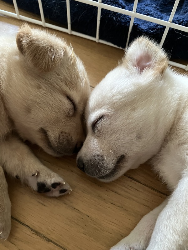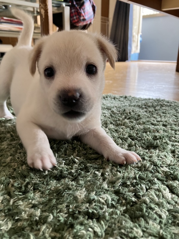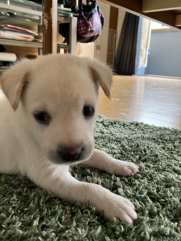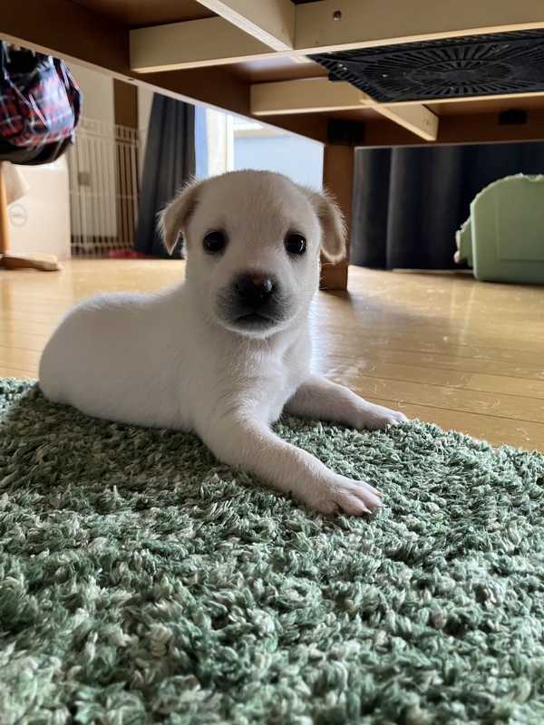 | 特徴(性格など) | 引き出し時は一番小さく、哺乳瓶にもなかなか慣れずに悪戦苦闘しましたが、しっかり体重も増えてコロコロ子犬らしく育っています。大きな目で見つめられると、ついつい抱っこしてしまいたくなるような子です。かわいいです。哺乳瓶から育ててきたので人は大好きです。 | ||