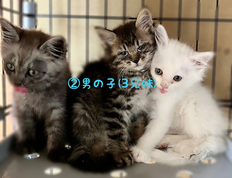 | 特徴(性格など) | 【代理投稿です】 御高齢の預かり様宅に居る為 情報少ないですが 3匹ともふわふわ長毛 ゴージャスです☆☆☆ ①パステルキジ? 女の子 全体的にグレー うっすらと虎柄 インパクト大! 幸せを運んでくれる♡の タヌキ顔 ②キジ 男の子 綺麗な虎柄 コロコロ体型 ③白 男の子 ペルシャ風 女の子のようなキョトン顔 いつも兄妹にくっついている 寂しがり |