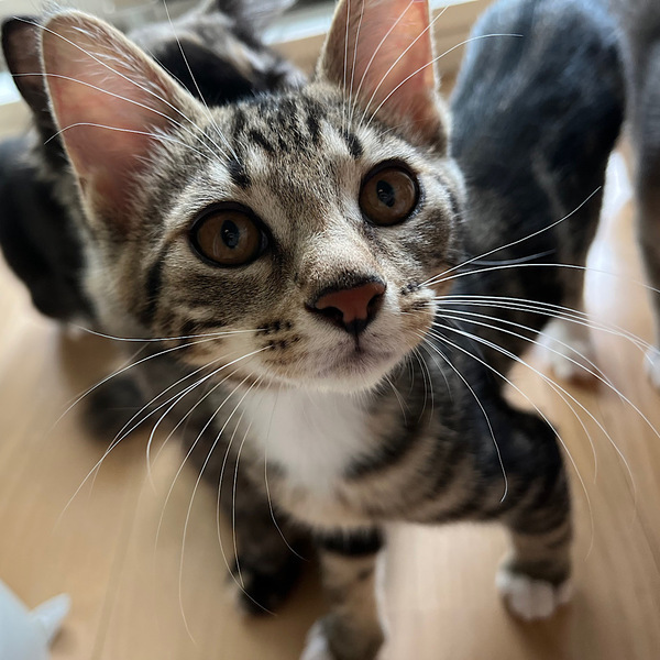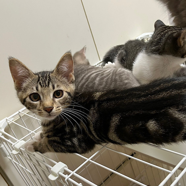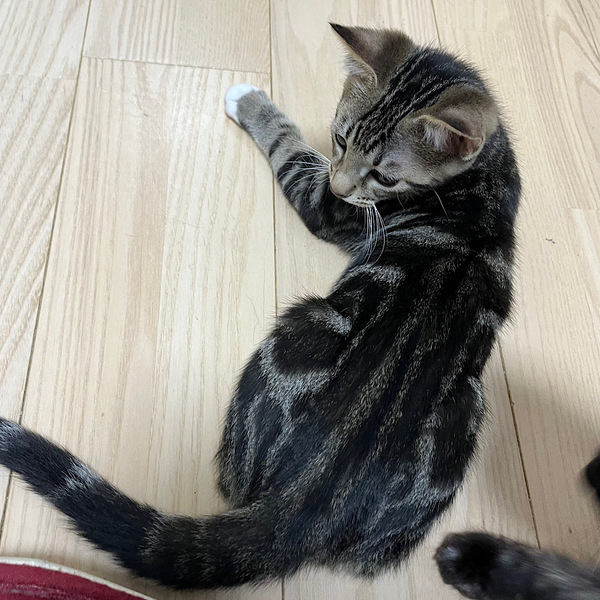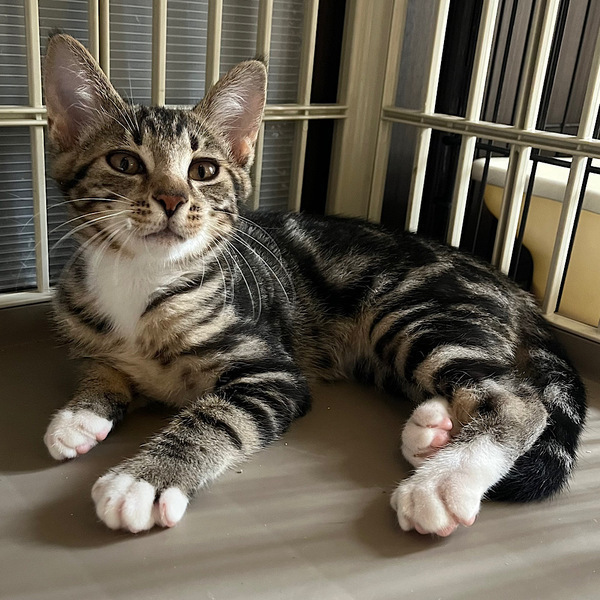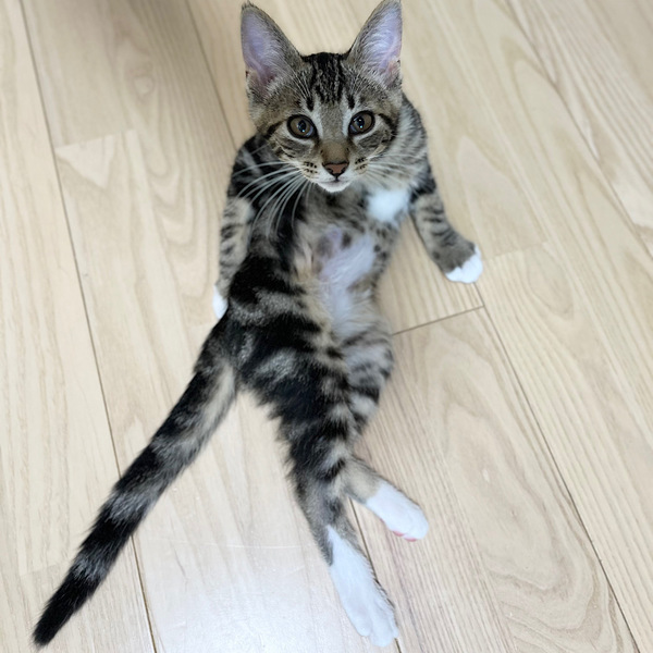 | 特徴(性格など) | キジ柄に靴下を履いた男の子。あだ名はラディ。アメショ?と思われる柄がキジの中に混じっています。 好奇心旺盛でスタイルと運動神経抜群。 人に対しては甘えん坊です。物怖じしないので、おもちゃで遊んであげるとすぐに仲良くなれるはず。 猫も大好きで、5にゃんきょうだいのお兄さん的な存在です。先住猫さんのいるご家庭でも仲良くできると思います。 |