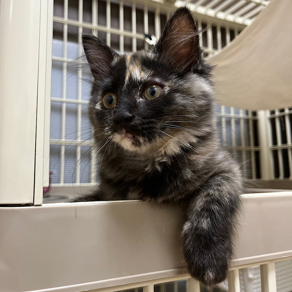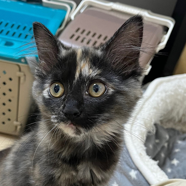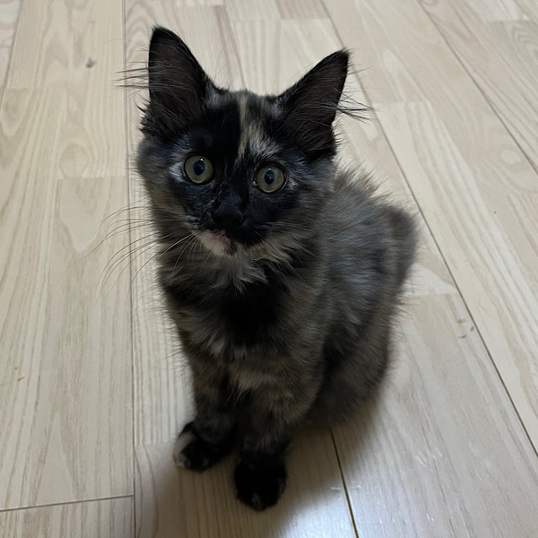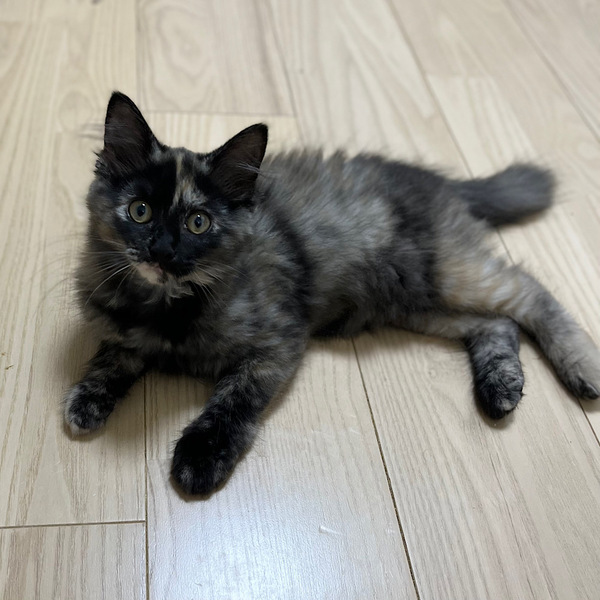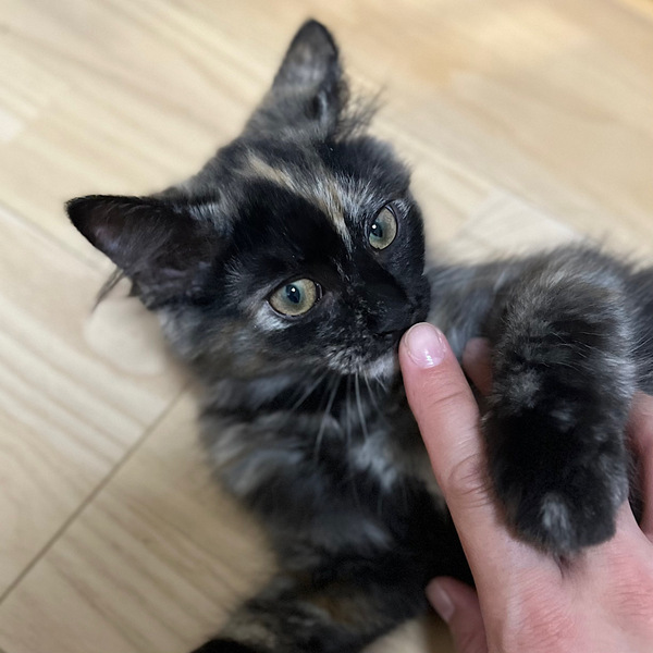 | 特徴(性格など) | サビ柄の長毛の女の子。顔の左側が明るい柄で、尻尾は長めのカギしっぽです。 とても人間が大好き。ゴロゴロが止まりません。撫でてくれないと足をちょんちょんつついたり、目の前に寝転がってアピールします。 きょうだい達に飛びついて喧嘩を始めるかと思いきや、がっしり掴んで動けない様にしてから毛繕いを始めるという、愛に溢れたお姉さんです。 先住猫さんのいるご家庭や、誰とでも仲良しなのできょうだい一緒のお迎えも大歓迎です。 お留守番があるご家庭は朝夜にしっかり遊んであげて下さい。 |