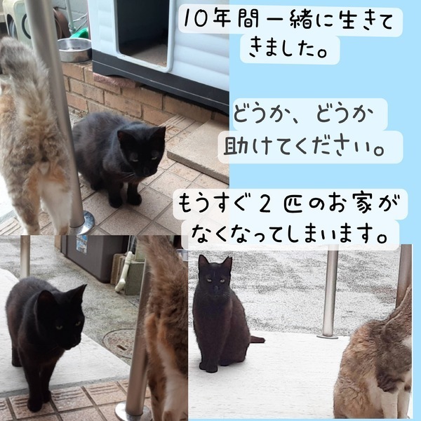 | その他(譲渡条件など) | ペット可能な物件にお住まいの方 脱走対策をきちんとしてくださる方 家族全員が、猫を飼う事を賛成している 家族に、猫アレルギーがいない。 完全室内飼いをしてくださる方 身分証明書の提示 猫たちが、10歳なので、シニアの方も お待ちしております。もしも、60歳 以上の方は、後見人をお願いいたします。 今回、里親様が決まってからの捕獲になりますので、病気が見つかる可能性もありますので、なるべく先住猫ちゃんがいらっしゃらない方、病気が見つかった場合でも、必ず一生大切にしてくださるお約束をしてくださる方にお願いしたいと思っています。 |