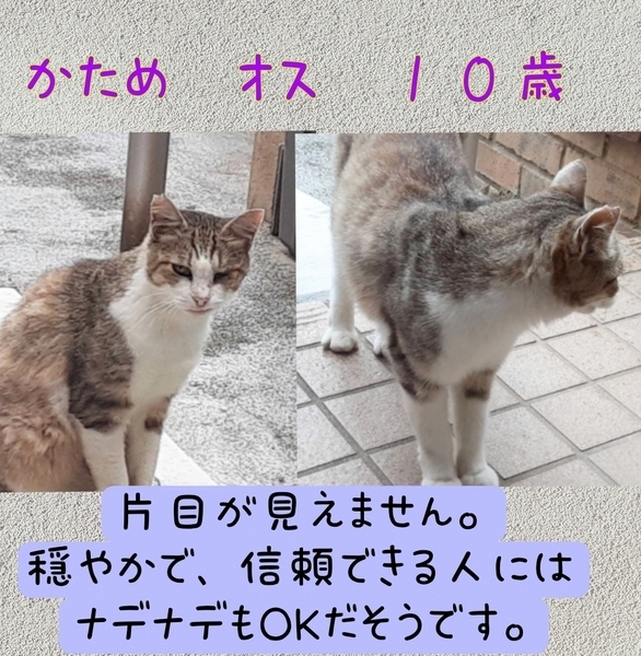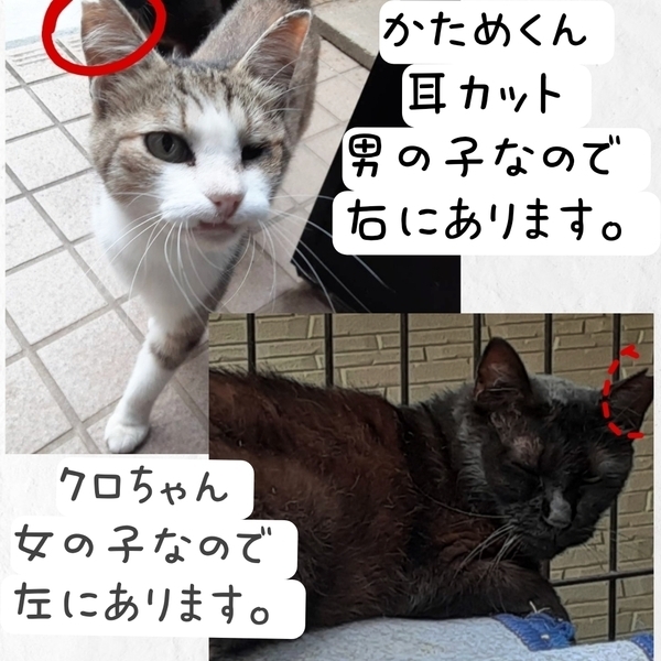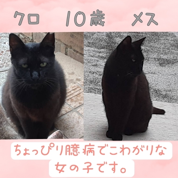 | 特徴(性格など) | シマミケ オス 10歳 穏やかで、信頼できる人には、撫でられるのも大丈夫です。片目が見えません。 耳カット有り。 黒猫 メス 10歳 少し臆病で、こわがりです。 知らない人が来ると逃げてしまいます。 耳カット有り |