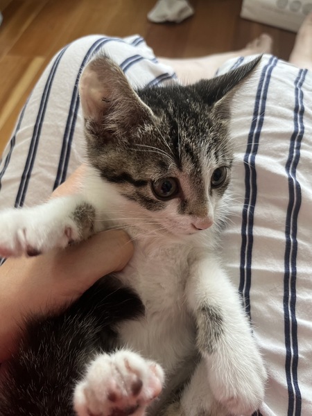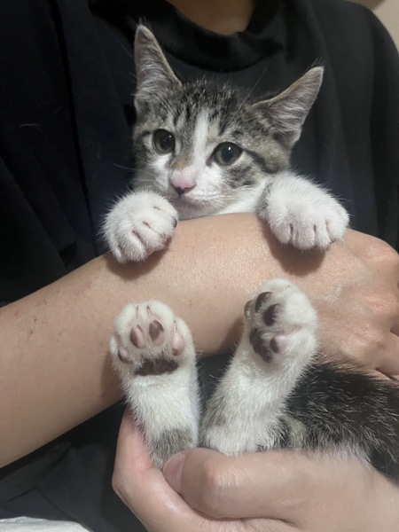 | 特徴(性格など) | <初期医療> 健康状態:良好 白血病ウイルス検査:陰性 エイズウイルス検査:陰性 ワクチン接種:7月20日 ノミダニ駆除薬:済み 糞便検査:済み とても綺麗なキジ白猫のイケニャン男の子です。 フードもよく食べ、トイレもバッチリです。 ビビりでとても甘えん坊で、よく遊んでいます。 妹(三毛猫)の乙と一緒に迎えてくださる里親様を希望します。 人馴れ抜群で、初心者の方、先住猫ちゃんのいるおうちでも大丈夫です。 まだ小さな子猫なので、お留守番のあるおうち、高齢者様、単身者様はご遠慮ください。 |