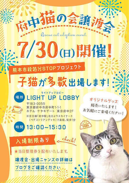 | その他(譲渡条件など) | ୨୧⌒⌒⌒⌒⌒⌒⌒⌒⌒⌒⌒⌒⌒⌒⌒୨୧ 府中駅から直結 子猫だらけの譲渡会お知らせ ୨୧⌒⌒⌒⌒⌒⌒⌒⌒⌒⌒⌒⌒⌒⌒⌒୨୧ 【日時】7月30日(日)13時〜15時半まで 【場所】LIGHT UP LOBBY (下記のリンクに詳細あり) https://chuneko.exblog.jp/32603337/ ※会場への直接のお問い合わせはお控えください。 ご質問はfuchu_nekonokai@yahoo.co.jpまでよろしくお願いします。 猫ちゃんを迎えるならば、子猫の時から育て上げたいな。 せっかく迎えるならば保護猫を選びたい。 そんなご家族は、ぜひ!譲渡会にお越し下さい! どの子達もレスキューしなければ生き抜いては行けなかった子猫達ばかりです。 当ボランティア団体がレスキューをし、皆さまの元へと送り届けるまでは育て上げました。 医療処置から健康面までをサポートした上で、かわいい子猫ちゃん達をご紹介させていただきます。 譲渡会に出場する子猫達の情報は、保護する場面から保護生活に至るまで、全て包み隠さずにYouTubeにアップされております。 ぜひ、YouTubeちゅー猫チャンネルをご視聴ください。 ↓↓↓ ฅ^•ﻌ•^ฅ♡ちゅー猫チャンネル https://youtube.com/@chuneko ▶今回出場する子猫達は、ほぼ全匹、未去勢or未避妊です。 それ以外の医療処置は全て終わっております(エイズ白血検査済み、ワクチン2回済み、マイクロチップ装着) ▶子猫ちゃんは長時間のお留守番はできません。ご希望される方は、お留守番の時間などスタッフまでご相談をお願いします。 パートタイムぐらいのお留守番は可能です。スタッフまでご相談ください。) ▶お届けする準備から、お迎えていただけた後のアフターケアーもキッチリとさせていただきますのでご安心ください。 【譲渡会にご参加くださる方々へ】 ₍ᐞ•༝•ᐞ₎◞ ̑̑ 混雑を防ぐ為、入場制限をさせていただきますが、ご予約の必要はございません。 入り口カウンターにてスタッフが整理券を配布いたしますのでご協力お願い申し上げます。 ₍ᐞ•༝•ᐞ₎◞ ̑̑ 初めて猫ちゃんを迎える方(特にお子様のいるご家庭)は、猫アレルギーの有無を明確にしてくださると選考しやすいです。 ₍ᐞ•༝•ᐞ₎◞ ̑̑ 譲渡会はお見合いのみの場となっております。ご来場前に必ず下記の事項をご参照ください。 【譲渡会のシステムについて】 https://chuneko.exblog.jp/32604872/ ₍ᐞ•༝•ᐞ₎◞ ̑̑ 譲渡会に出場する猫ちゃん達の保護時からの情報などYouTube【ちゅー猫チャンネル】にて配信しております。 https://youtube.com/@chuneko 頑張って生き抜いて来たちゅー猫子ども達との、素敵なご縁をお待ちしております♡ ฅ^•ﻌ•^ฅ♡ ご見学やグッズ購入希望者の方々へ ฅ^•ﻌ•^ฅ♡ 会場はカフェ営業をしておりますので、お飲み物をオーダーしていただければ中のお席でお寛ぎできるようになっております。 混みあっている場合はお断りさせていただく場合があります。会場入り口の受付スタッフに一言お伝えください。 気兼ねなく遊びにいらしてくだれば幸いです! |