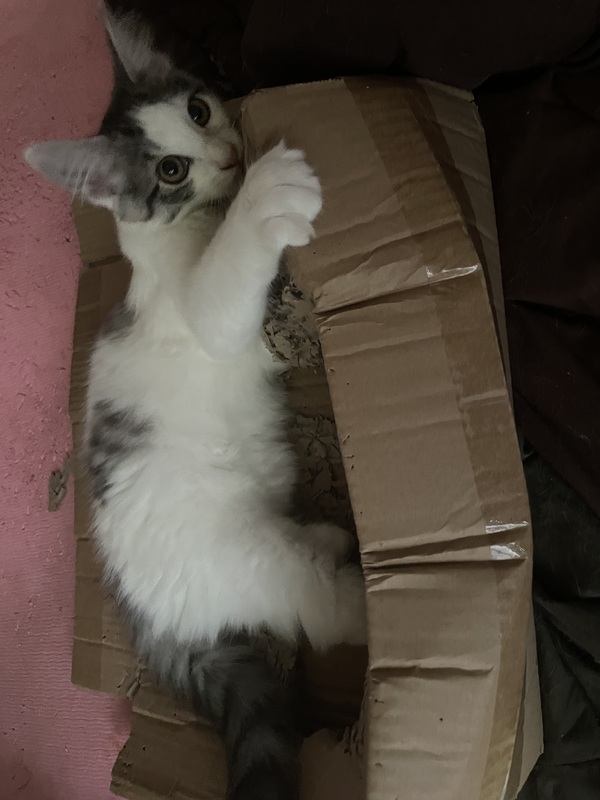 | 特徴(性格など) | 白が多く背中としっぽにサバ柄?の模様がある短毛でしっぽが長い女の子と白が多く中長毛のグレーっぽいサバ柄模様がある男の子になります。お父さんがメインクーンとの事で成長とともに長毛になるかもしれません。男の子は結構大きくなるかもしれません。2匹元気に遊んで居ます。 | ||