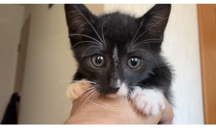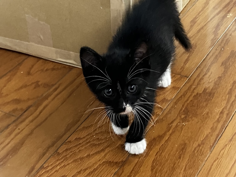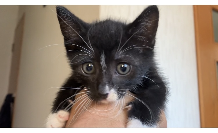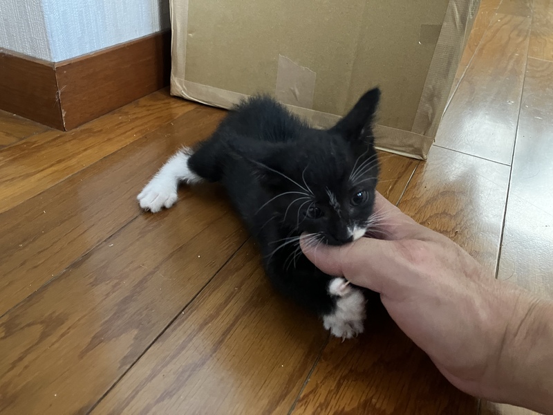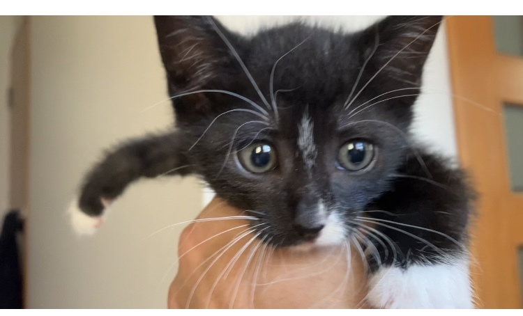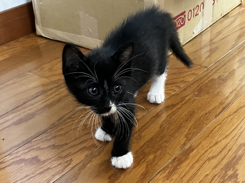 | 特徴(性格など) | 黒多め、お腹側白色。足先鼻先お髭白。 まだ小さいこともあり好奇心旺盛で走り回っています。 ようやくおトイレの砂が使えるようになってきたところです。 カリカリも食べられるようになってきました。 |