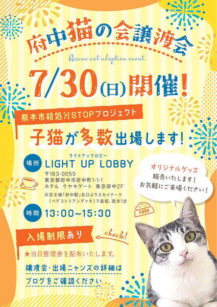| その他(譲渡条件など) | ୨୧⌒⌒⌒⌒⌒⌒⌒⌒⌒⌒⌒⌒⌒⌒⌒୨୧ 府中駅から直結 子猫だらけの譲渡会お知らせ ୨୧⌒⌒⌒⌒⌒⌒⌒⌒⌒⌒⌒⌒⌒⌒⌒୨୧ 【日時】7月30日(日)13時〜15時半まで 【場所】LIGHT UP LOBBY (下記のリンクに詳細あり) https://chuneko.exblog.jp/32603337/ ※会場への直接のお問い合わせはお控えください。 ご質問はfuchu_nekonokai@yahoo.co.jpまでよろしくお願いします。 猫ちゃんを迎えるならば、子猫の時から育て上げたいな。 せっかく迎えるならば保護猫を選びたい。 そんなご家族は、ぜひ!譲渡会にお越し下さい! どの子達もレスキューしなければ生き抜いては行けなかった子猫達ばかりです。 当ボランティア団体がレスキューをし、皆さまの元へと送り届けるまでは育て上げました。 医療処置から健康面までをサポートした上で、かわいい子猫ちゃん達をご紹介させていただきます。 譲渡会に出場する子猫達の情報は、保護する場面から保護生活に至るまで、全て包み隠さずにYouTubeにアップされております。 ぜひ、YouTubeちゅー猫チャンネルをご視聴ください。 ↓↓↓ ฅ^•ﻌ•^ฅ♡ちゅー猫チャンネル https://youtube.com/@chuneko ▶今回出場する子猫達は、ほぼ全匹、未去勢or未避妊です。 それ以外の医療処置は全て終わっております(エイズ白血検査済み、ワクチン2回済み、マイクロチップ装着) ▶子猫ちゃんは長時間のお留守番はできません。ご希望される方は、お留守番の時間などスタッフまでご相談をお願いします。 パートタイムぐらいのお留守番は可能です。スタッフまでご相談ください。) ▶お届けする準備から、お迎えていただけた後のアフターケアーもキッチリとさせていただきますのでご安心ください。 【譲渡会にご参加くださる方々へ】 ₍ᐞ•༝•ᐞ₎◞ ̑̑ 混雑を防ぐ為、入場制限をさせていただきますが、ご予約の必要はございません。 入り口カウンターにてスタッフが整理券を配布いたしますのでご協力お願い申し上げます。 ₍ᐞ•༝•ᐞ₎◞ ̑̑ 初めて猫ちゃんを迎える方(特にお子様のいるご家庭)は、猫アレルギーの有無を明確にしてくださると選考しやすいです。 ₍ᐞ•༝•ᐞ₎◞ ̑̑ 譲渡会はお見合いのみの場となっております。ご来場前に必ず下記の事項をご参照ください。 【譲渡会のシステムについて】 https://chuneko.exblog.jp/32604872/ ₍ᐞ•༝•ᐞ₎◞ ̑̑ 譲渡会に出場する猫ちゃん達の保護時からの情報などYouTube【ちゅー猫チャンネル】にて配信しております。 https://youtube.com/@chuneko 頑張って生き抜いて来たちゅー猫子ども達との、素敵なご縁をお待ちしております♡ ฅ^•ﻌ•^ฅ♡ ご見学やグッズ購入希望者の方々へ ฅ^•ﻌ•^ฅ♡ 会場はカフェ営業をしておりますので、お飲み物をオーダーしていただければ中のお席でお寛ぎできるようになっております。 混みあっている場合はお断りさせていただく場合があります。会場入り口の受付スタッフに一言お伝えください。 気兼ねなく遊びにいらしてくだされば幸いです! |