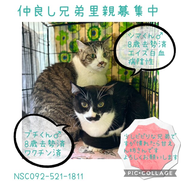| 特徴(性格など) | ●猫の種類 : 雑種 キジ白(シマくん) オス・黒白(ブチくん) オス 兄弟 ●猫の年齢:8歳 ●保護している場所:福岡市城南区 ●現在の健康状態:健康状態良好、食欲旺盛8歳を感じさせないシマくんとブチくんです。 ノミダニお腹の虫下し、エイズ白血病陰性です。去勢手術済み、ワクチン済み ●性格・特徴:少し臆病なところがありますが、慣れるとスリスリゴロゴロしてきます。 どっしりしたシマくんの甘え方がかわいいです! |