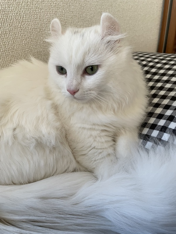 | 特徴(性格など) | アメリカンカールとマンチカンのハーフでキンカローという猫種です。長毛、短足の真っ白な猫様です。性格はとても人懐っこく、好奇心旺盛で元気いっぱいな子です。 | ||