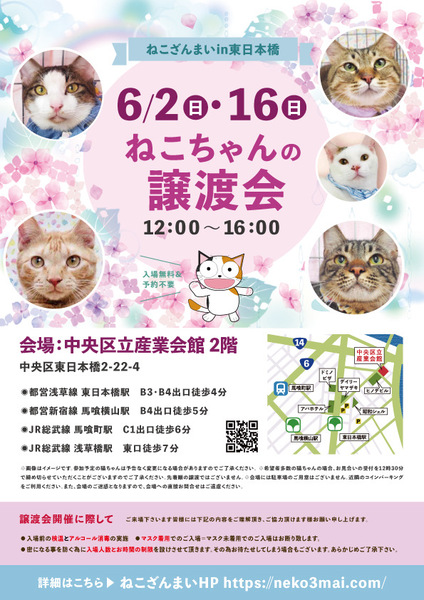 | その他(譲渡条件など) | 11:30より、2階会場入口にて受付を開始します。 受付時に入場予定時間が記入された整理券をお配り致しますので、整理券を受け取った方はお時間になりましたら2階会場入口に番号順にお並び下さい。 ※11:30より早くいらしてもお待ちいただく場所がございません。 また、近隣にお住まいの方や他階フロアのご利用者様にご迷惑となる場合がございますので、受付開始時間にあわせてお越しくださいますよう、何卒ご協力お願いいたします。 ※ねこざんまい譲渡会は、先着順で里親様を決定する譲渡会ではありません。 先に申し込みをした方を優先することもありません。 お話をして、その猫ちゃんに合ったおうちに決めさせていただいております。 12時に開場し、里親様の決定は14時以降となります。 14時以降にご入場の場合、希望の猫ちゃんが決定している可能性があります。 また1頭に対し多数のご希望をいただいた場合、早めに申し込みを締め切らせていただく場合がございますので、予めご了承下さい。 里親様決定は14時以降となります。 その後、迎え入れ準備の説明等のお時間も頂戴しますので、お時間に余裕を持ってご来場下さい。 【新型コロナウィルス感染予防対策について】 譲渡会開催に際し、ご来場下さいます皆様には以下の内容をご理解頂き、ご協力頂けます様お願い申し上げます。 ●入場前の検温とアルコール消毒の実施 ●マスク着用でのご入場=マスク未着用でのご入場はお断り致します ●入場人数の制限をさせていただきます(来場多数の場合は入れ替え制となります) ●時間と人数の制限=密になる事を防ぐ為に入場人数とお時間の制限を設けさせて頂きます その為お待たせしてしまう場合もございます ●会場利用規約により、ご来場者様の連絡先を控えさせていただきます あらかじめご了承下さい。 諸々の制限がございますが、安心・安全な譲渡会運営のためにご理解・ご協力いただきますようお願い申し上げます。 ~~~~~~~~~~~~~~~~~~~~~~~~~~~~~~ ★仔猫ご希望の里親様★ 仔猫ちゃんたちは、まだ体がしっかりしていない赤ちゃんです。 下痢だけでも数時間対応ができなかっただけ死に至る事もあります。 その為、月齢に応じたお留守番時間を設けさせていただいております。 また、子猫ちゃん(6ヶ月未満)の里親様には子猫支援金のご協力をお願い致しております。 ★猫ちゃんとのお見合いは譲渡会で!★ ねこざんまいの猫ちゃんは譲渡会でのお見合いのみとなります。 『この子はいつ譲渡会に参加するの?』『譲渡会場の場所はどこ?』などは、ねこざんまいホームページをご覧ください。 https://neko3mai.com/ ★楽しく猫ちゃんと触れ合って★ ねこざんまい譲渡会は、猫ちゃんも里親様も保護主も笑顔で過ごせる譲渡会を目指しています。 これから20年以上、楽しい時も、悲しい時もいつも傍にいてくれる大切な家族になる猫ちゃんです。 会場には沢山の猫ちゃんがいます。 1匹1匹、触れ合って猫ちゃんとお話してください。 『初めて猫ちゃんを家族に迎える方』 『先住猫ちゃんのお友達を迎える方』など トライアルの仕方や先住猫ちゃんと仲良くなるコツなど経験豊富な保護主やスタッフにお気軽にご相談ください! 猫を愛し、そして猫に愛されている猫好きスタッフと保護主がアドバイスさせていただきます。 ★里親希望のみなさまへ★ ペットではなく、家族一員としてたっぷり愛情を注いでくださるご家庭をお待ちしております。 恐れ入りますが ●学生の方、子猫・幼猫希望の60才以上の方のみのご家庭 ●脱走防止対策にご協力いただけない方 は原則譲渡を遠慮させていただいております。 ●一人暮らし・同棲(事実婚)の方 保護主の希望や猫の年齢・性格等により、ご希望に添えない場合もございます。 参加猫ちゃんは、それぞれ保護主(実際に猫ちゃんを自宅に入れ、保護をしている方)が異なります。 詳しい条件なども異なる場合がございますので、会場内で直接保護主とお話ください。 〖共通条件〗 1.終生飼育 2.完全室内飼い 3.脱走防止対策へのご協力 4.避妊去勢手術 5.契約書類へのサイン 6.定期報告 7.医療費等の負担 当日の猫ちゃんを連れて帰ることはできません。後日、保護主が里親様のご自宅までお届け致します。 その為、移動の際の猫ちゃんの負担を月齢などから考慮し、お届け地区を限定させて頂くこともございますのでご了承ください。 ご理解とご協力のほど宜しくお願い致します。 ☆よくある質問☆ ・譲渡の条件 ・ご負担頂く費用 ・譲渡会の場所等は ホームページに詳しく掲載させて頂いておりますのでご覧ください。 https://neko3mai.com/ メールでのお問い合わせはすぐにご返答出来ない場合がございますのでご了承ください。 ホームページ https://neko3mai.com/ お問い合わせ http://www.neko3mai.com/contact/form_general.html ねこざんまいブログ http://ameblo.jp/neko3mai/ |