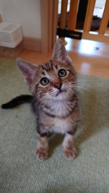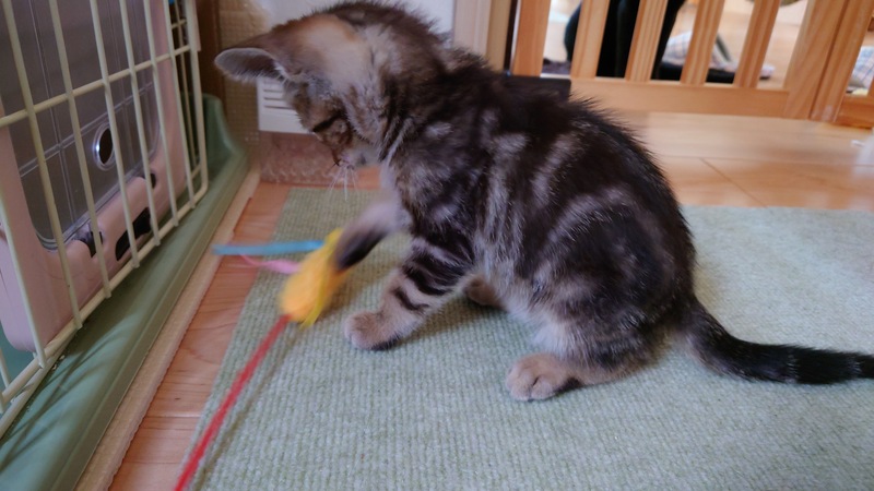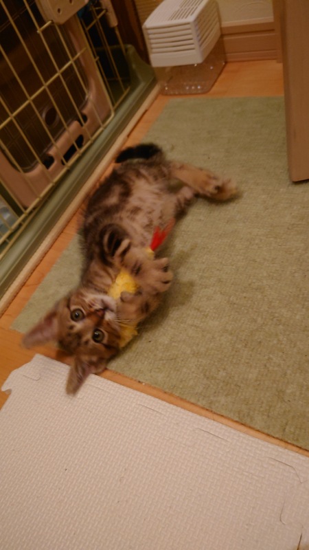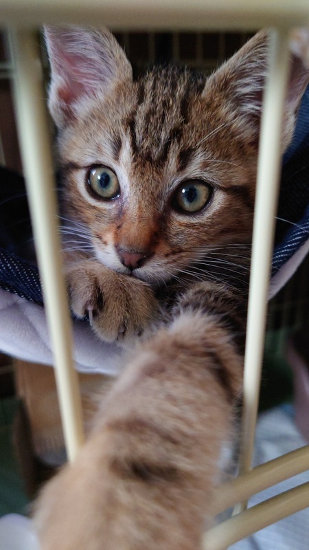 | 特徴(性格など) | こげ茶色の渦巻き縞模様なオスの子猫です。 鳴き声はあまり大きくなく、ケージでお留守番も出来ますが、遊ぶのが大好きな男の子です。 |