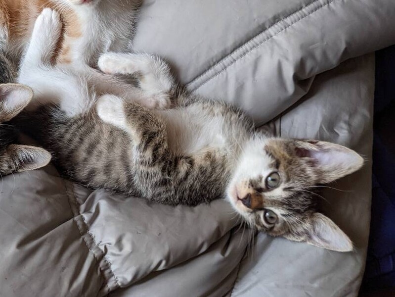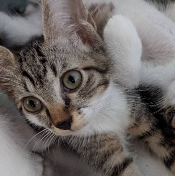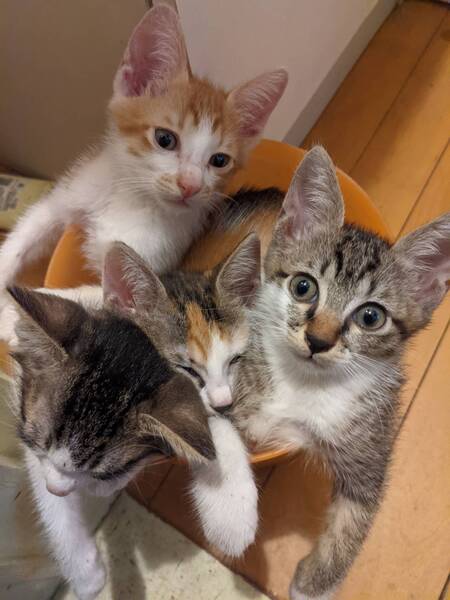 | 特徴(性格など) | 生後約2ヶ月。 キジ白のキジ柄多め。お腹は真っ白。 たぶん女の子(素人判断なので不確定です) 猫ママと、4兄妹と賑やかな環境で、育っています。 完全室内飼いで育っています。 4兄妹の中で一番控えめな性格でおとなしいです。 甘えん坊な性格です。 ノミ・ダニ駆除済。 |