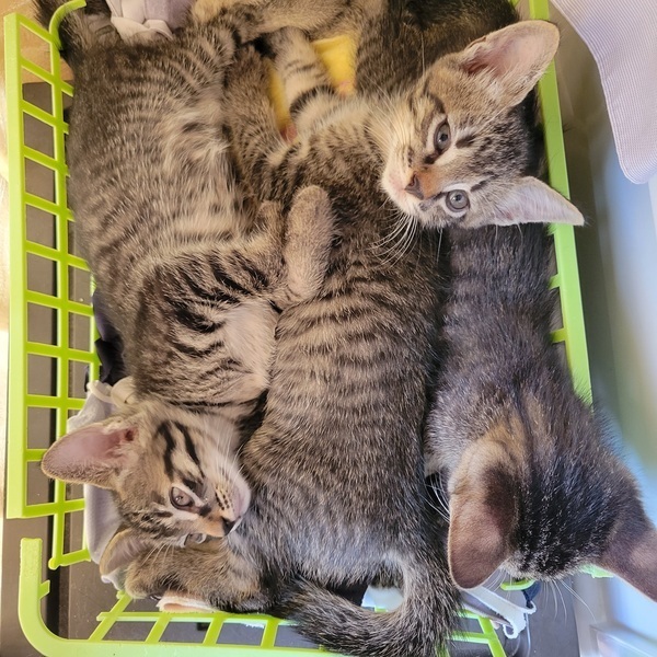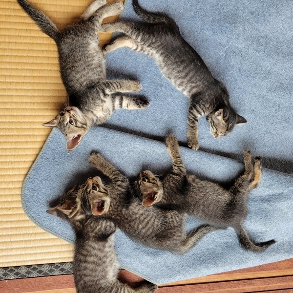 | 特徴(性格など) | キジトラ黒の赤ちゃん5匹(みんな同じ柄)と母猫です。 (子猫はメス2匹、オス3匹) オスは元気いっぱい! メスはどちらかというと、マイペースです。 子猫も母猫も人馴ればっちりです。 母猫はだっこも撫でられるのもだいすきな甘えん坊さんです。 |