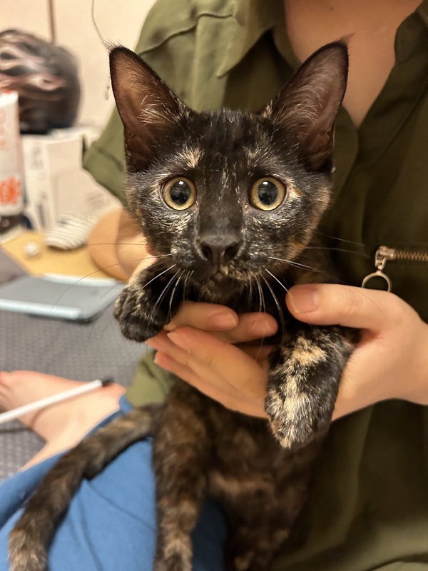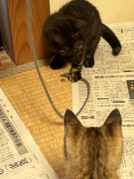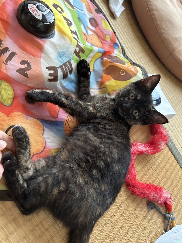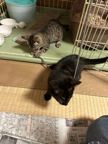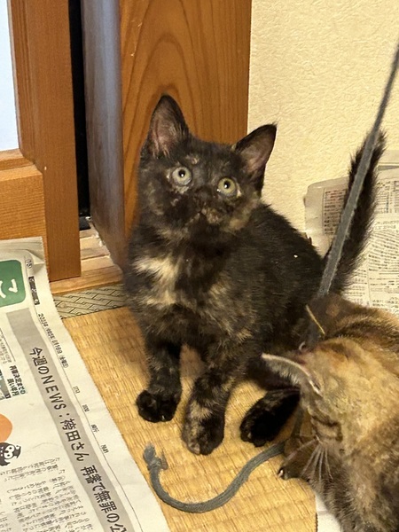 | 特徴(性格など) | 色柄 黒が強めのサビからです。 性格 新しい場所でもガンガン進んで探検して、先住猫にも自分から寄っていく物おじしない子です。ケージも外側から登ってしまうくらい元気です。 |