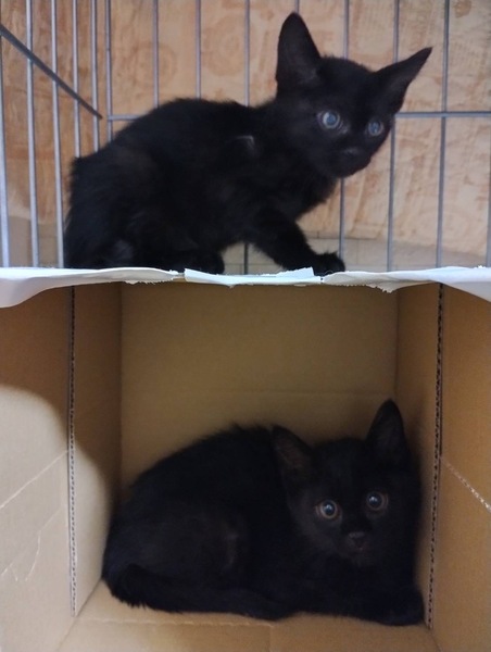 | 特徴(性格など) | ママ猫【メス】:瞳の大きなクリッとした目のかわいいお顔。頭のいいといわれているサビ柄。毛色は薄めのサビ柄。サビ柄ファンが増えるのがよくわかるくらい、とにかく賢くおとなしくお顔はピカイチかわいいママ猫ちゃんです。生後約1歳くらいかと思います。歯もきれいく、毛艶もきれいな若いお母さん猫。初産かと。 子猫2匹【オス・メス】:ママのいい所とりえた、大きな瞳。まじりっけのない黒色の毛色。生後約2か月。まだ保護したてもありドキドキしておりますが、チュールは手からペロペロと舐めてくれてかわいい黒猫ちゃんです。性別はオスとメスの兄妹。双子???と言いたくなるくらいどちらがどっちかわかりません(笑)ただママにそっくりなクリクリした目が本当にかわいいお顔です。性格もおとなしく、賢い子たちです。黒猫兄妹はオススメです! |