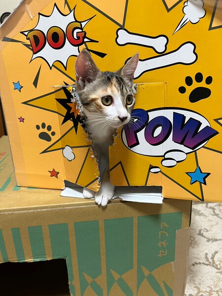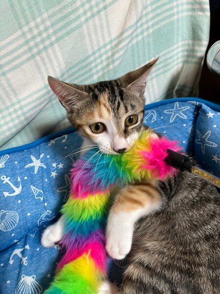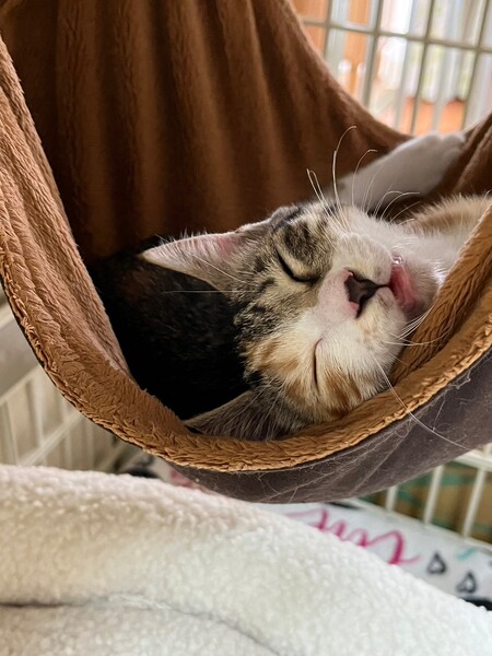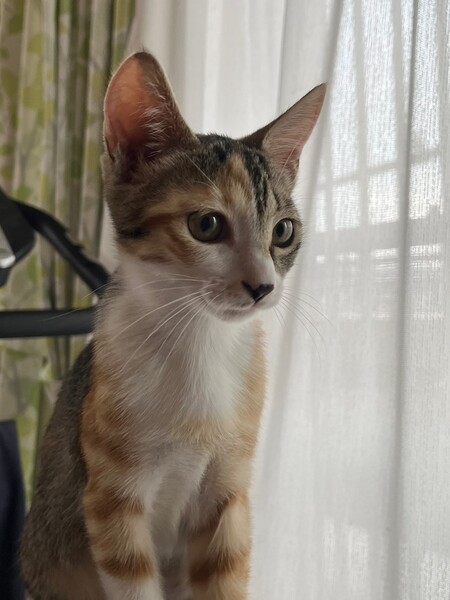| 特徴(性格など) | 2023.4.16生まれ(推定) 毛色:三毛 ちょっとタレ目の可愛いキジ三毛の女の子。 茶トラも入っている不思議模様です。 甘えん坊でサイレントニャーをしたり、妹マノアの肉球をチュパチュパしたりします。 妹が嫌がると自分の肉球や人の手をチュパチュパ。 遊ぶのも大好き♡ ニャンプロしたり、おもちゃを追いかけたり、激しいです。 |