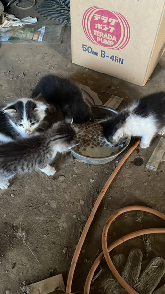 | 特徴(性格など) | 黒白、白黒×2、キジトラ×2、 諸事情により、完全室内飼育が出来ない状況です。 |