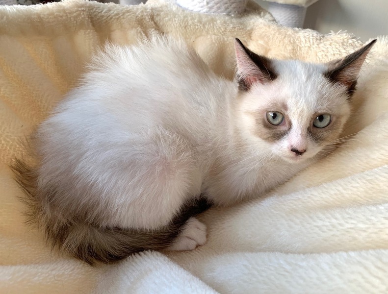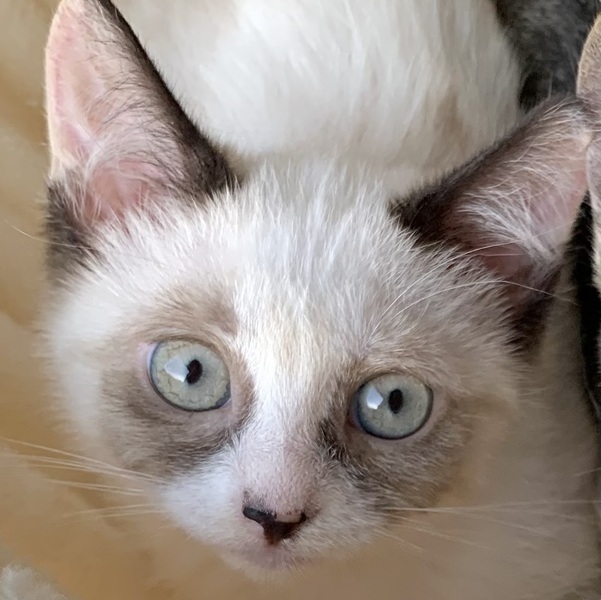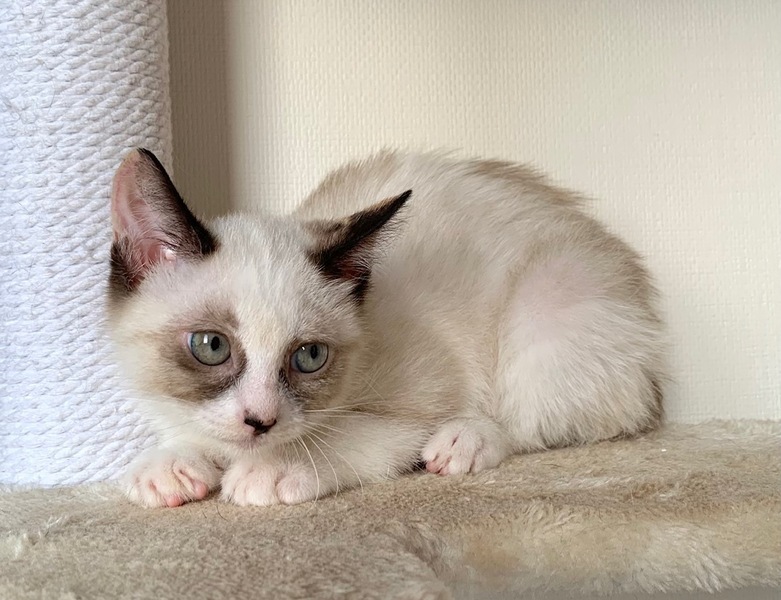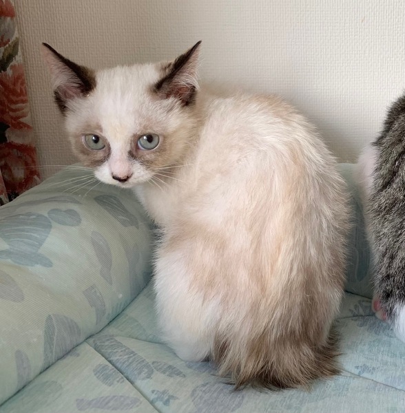 | 特徴(性格など) | 【仮名】真子ちゃん 【性格】ライトブルーのおめめが とってもキレイな真子ちゃん♪ シャム風ポインテッドなんですが 何故かシッポは三毛なんです( ゚Д゚) このコを一言で表すなら漫画のようなブラコンにゃんこ(笑) おそらくお兄ちゃんと一緒じゃないと生きていけないんじゃないかな? ってくらいの溺愛っぷりですね(笑) でもおもちゃ遊びやにゃんプロは気の強さをいかんなく発揮してます♪ まだまだ修行中の身なので兄妹の真くんと ペアでのお迎えを希望します♪ ※1ピキ譲渡不可 |