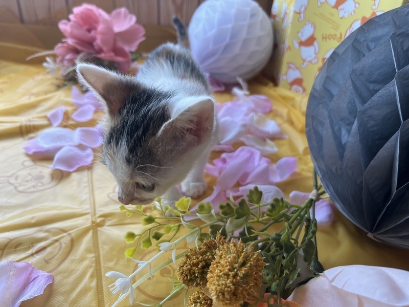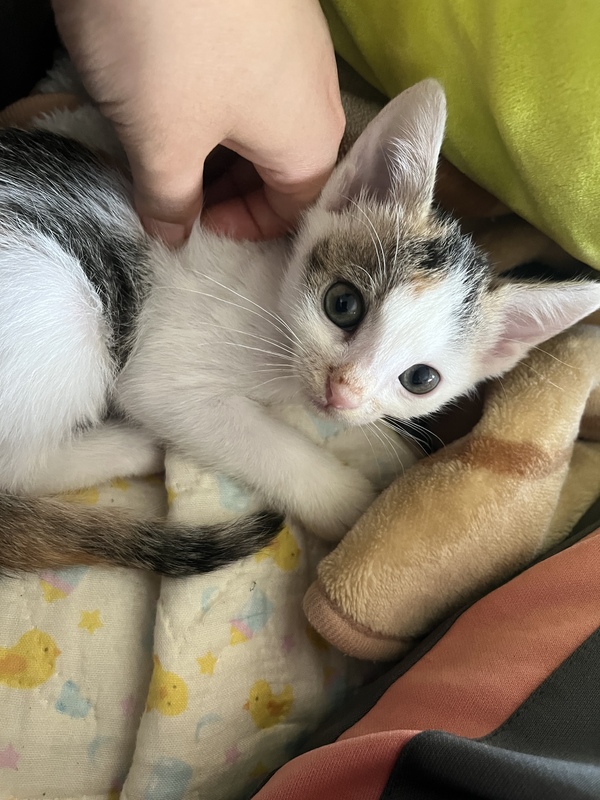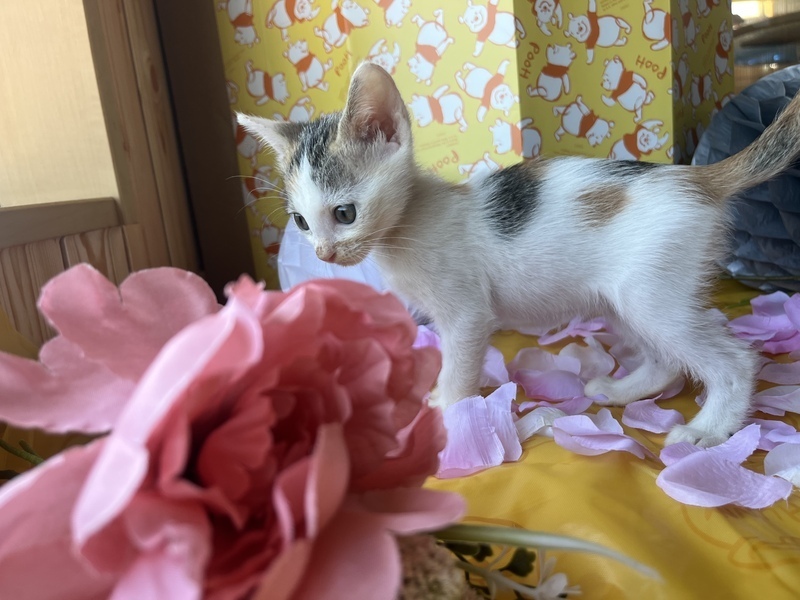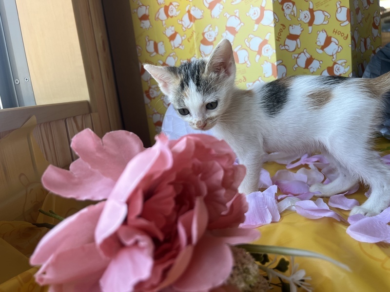 | 特徴(性格など) | 白多めの三毛猫ちゃん 兄弟より少しビビりですが、人を怖がることなく元気です 猫風邪治りました。 ノミダニ駆除、便検査陰性、ウイルス陰性 |