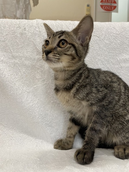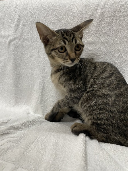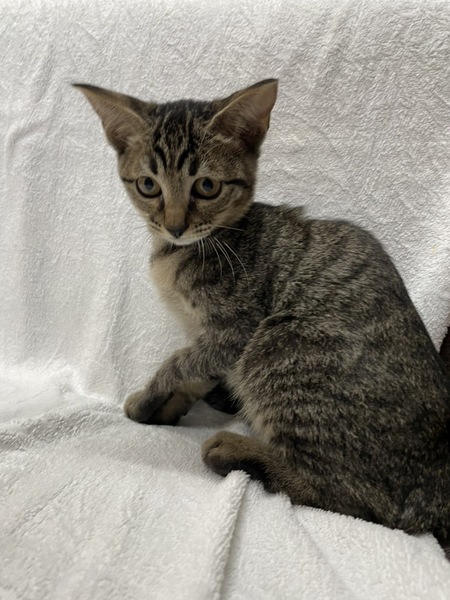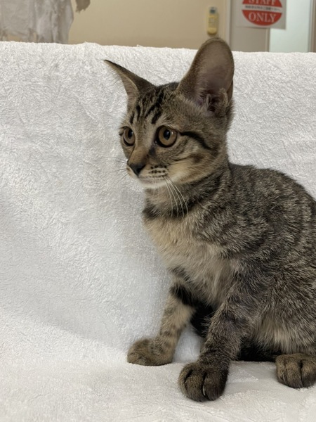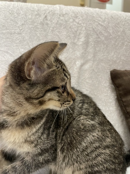 | 特徴(性格など) | 模様はキジトラ。 ワクチン済。 ノミ予防済。 猫エイズ・白血病陰性。 当院に来たときは、左の前脚を骨折していました。 7/29にレントゲンを撮ったところ完治していたので、固定していたものを外しました。 人なれは、完璧ではありませんが、自分から近づいてきてくれたり、抱っこさせてくれたりと慣れてはいます。 |