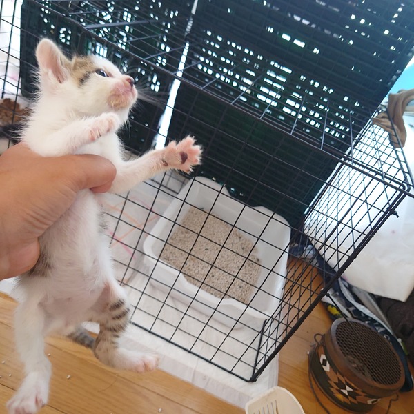 | 特徴(性格など) | 茶色の斑。ビビリののんびり屋さん。ビビリでも攻撃性はなく隠れる子です。トイレ、ご飯はしつけてあり一人(一匹?)でできます。 小さいながら撫でられるのが好きな子で撫でるとゴロゴロ鳴きます。 |