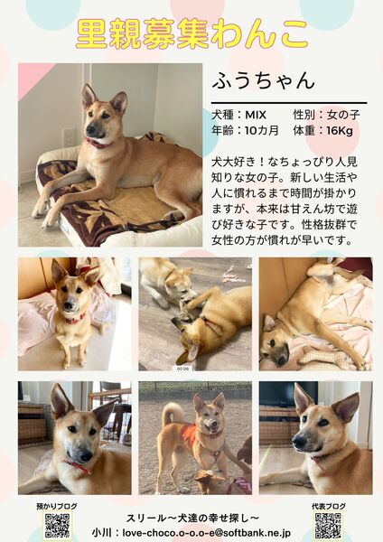 | 特徴(性格など) | 【プロフィール】 名前:ふう 生年月日:2022年秋ごろ 犬種:ミックス 体重:18Kg トイレ:◎(トイレシートで上手にできます) ご飯:◎ お散歩:◎ おやつ:◎ 犬:◎ 人:〇 犬が大好きな優しい女の子です。 相手のわんこの体格や性格に合わせて上手に接することができます。 少しシャイで初めての人や場所に緊張してしまいますが、慣れれば無邪気で愛くるしい女の子です。 お散歩は初めての場所でも上手に歩けます。 犬と遊ぶのが大好きですごく遊び上手で、ドッグランではいつも人気者になる子です。 おもちゃでの一人遊びも大好きで、おもちゃ箱のおもちゃを全部出して遊んだりします。 車にはケージでも係留でも大人しく乗り、静かに過ごすことができます。 小さい子の大きな声や突然の動きにびっくりしてしまうので 小学生以下のお子様が居ない家庭を希望します。 預かり宅での生活は約半年ほどですが、預かり家族の帰宅には大喜びしてくれます。 急な物音や動きに驚いてしまいますが、暴れたりなどはなく異常がないことが分かればすぐに落ち着きます。とても賢くコミュニケーションの取りやすい、パートナーになれるタイプのわんこです。 預かりのインスタグラムでは普段のふうの無邪気な様子を見ることができるのでぜひのぞいてみて下さい! 預かりインスタグラム: https://www.instagram.com/0103hanayuri0903/ 代表ブログ: https://ameblo.jp/sourire-hogoinu/theme-10117742546.html スリール公式HP: https://sourire-hogoinu.jimdofree.com/ 【健康状態】 フィラリア:- 狂犬病ワクチン:済 混合ワクチン:済 ノミ・ダニ:毎月 駆虫 :済 血液検査:済 避妊手術 :済 マイクロチップ:済 血液検査で特に問題はなく、いたって健康です。 ご飯もよく食べ、ウンチの状態も良いです。 |
