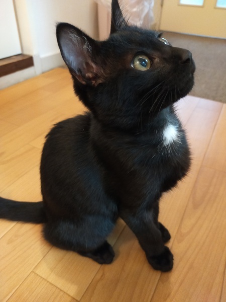| 特徴(性格など) | 黒猫です。 首元にボタンのような、お腹にパンツのような白い部分があります。 しっぽは半分ぐらいです。 |