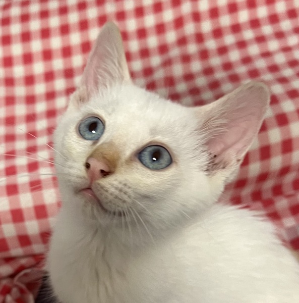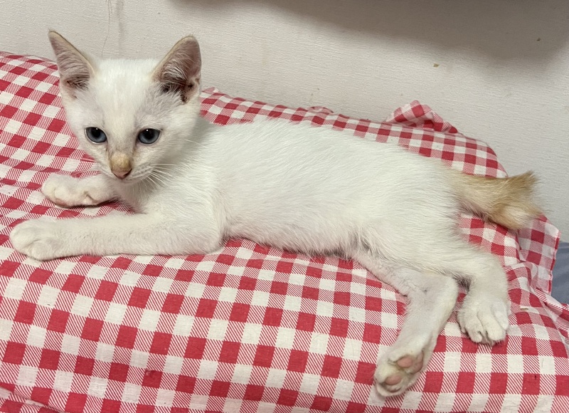 | 特徴(性格など) | 白✖️茶のポイント 目はブルーです。 とにかく甘えん坊で人のそばにいつでもひっついていたい男の子です。他の子猫たちとも良好な関係を築けています。 |
