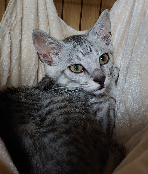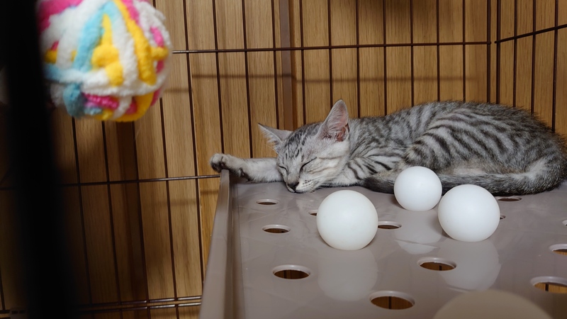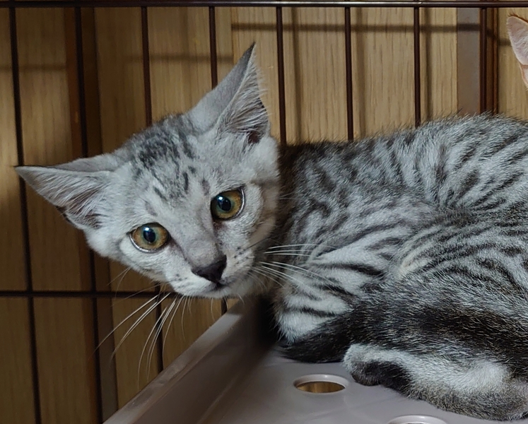 | 特徴(性格など) | 全身綺麗なサバトラの男の子です。 警戒心がまだありますが抱っこはできます。 オモチャで遊び食欲旺盛な元気な子です。 |