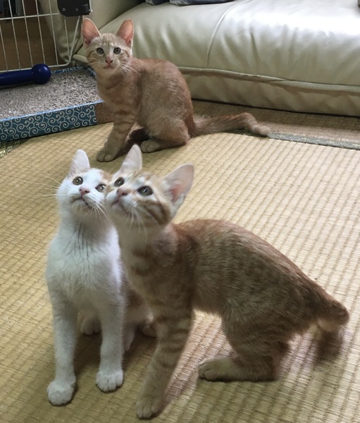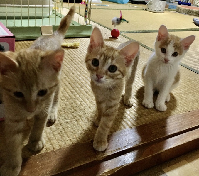 | 特徴(性格など) | あおば(仮) 茶白 メス 物怖じしない甘えん坊 ひなた(仮) 茶トラ メス 好奇心旺盛 リーチ(仮) 茶トラ オス シャイな遊び好き |