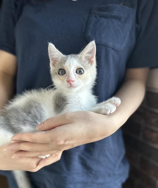 | 特徴(性格など) | とっても活発な男の子です。 オモチャで遊んであげると飽きることなく遊び続けます。 走るのも早く、高い所にも簡単に登れ、運動神経は抜群です。 抱っこは、今の所遊びが優先なので好きではないですが、一年もすれば落ち着きます。 ゴロゴロ言って、スリスリ甘えてくれます。 白地に、薄いグレー斑、グレーのシッポは真っすぐで先だけ巻いています。 生後二週齢位で保護していますので、人には十分慣れています。 ドライフードも食べますが、ウエットフードの方が好きで、ササミも好きです。 牛乳を飲んでも下痢はしません。冷蔵庫を開けると鳴いて牛乳を催促してとっても可愛いです。 鳴き声はとても小さいです。 猫エイズ・白血病は陰性。 ワクチンは一回済み。 お腹の寄生虫駆虫は一回済み。 |