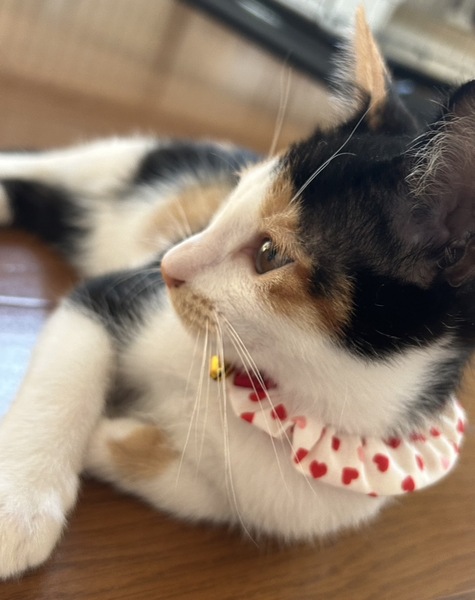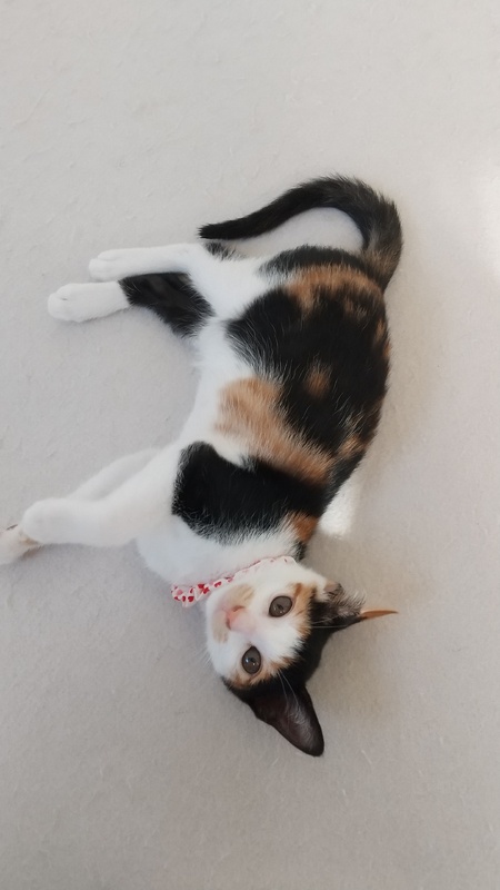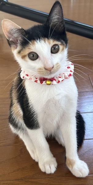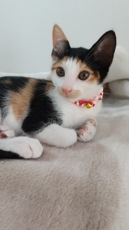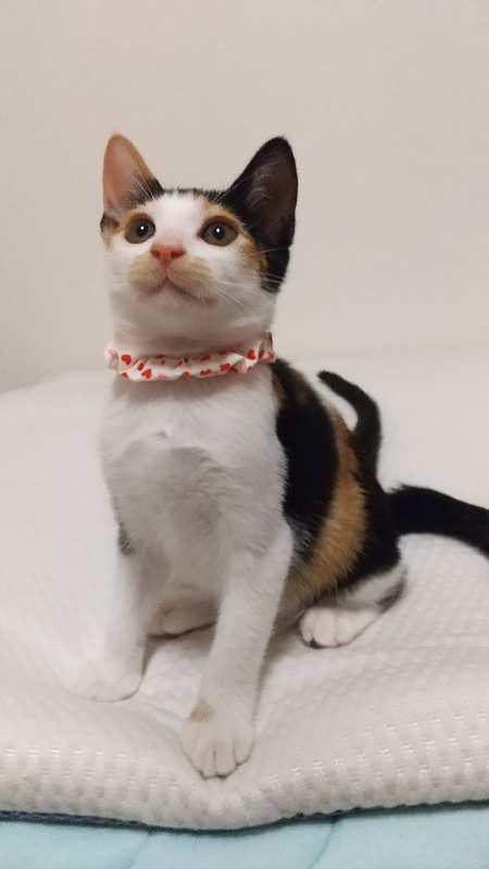 | 特徴(性格など) | 前髪をぱっつんと切ったような模様が個性的で、とてもかわいい三毛猫です。しっぽも長いです。 甘えん坊でいつも側に来て寄りかかってきます。ぐるぐると甘えたり、フミフミチュパチュパしたりしてとてもかわいいです。 8月11日現在体重1.5キロです。 エイズ・白血病検査陰性 3種ワクチン2回接種済み ノミ・ダニ・駆虫薬2回投与済み |