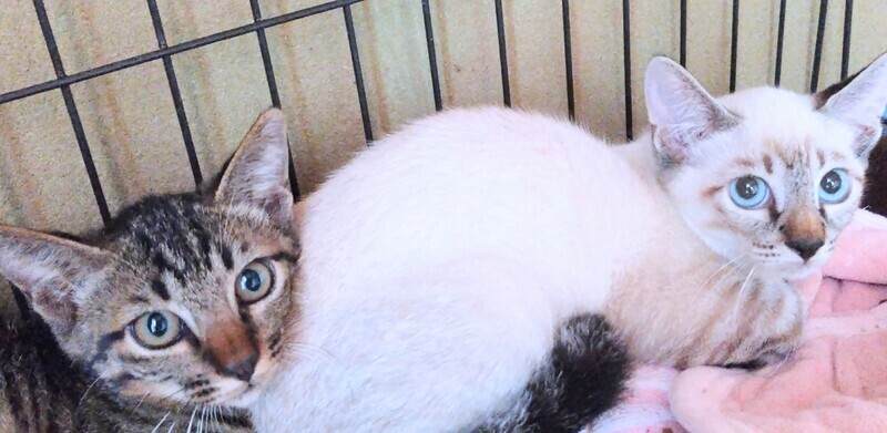 | 特徴(性格など) | まだはっきり オスメス わかっておりません!白シャムmix仔猫の方が多分 姉で〜 黒いキジ仔猫が多分 弟と思います〜 白シャム子猫はしっかり者で〜 黒キジ仔猫を一生懸命 かばってます〜 黒キジは気が弱くて白いシャムに頼りっぱなしです〜 甘えん坊でぼーっとしてます〜 ●白いシャム子猫はとっても綺麗なブルーの瞳です〜 美形です〜 ●黒キジは甘えん坊なタイプです〜 すぐに懐くと思います〜 ●今は 怖さのあまり シャーシャー 言ってます ●2匹とっても助け合って仲良しなので〜 2匹一緒にお願いいたします! 1匹だけでもお譲りできません! |