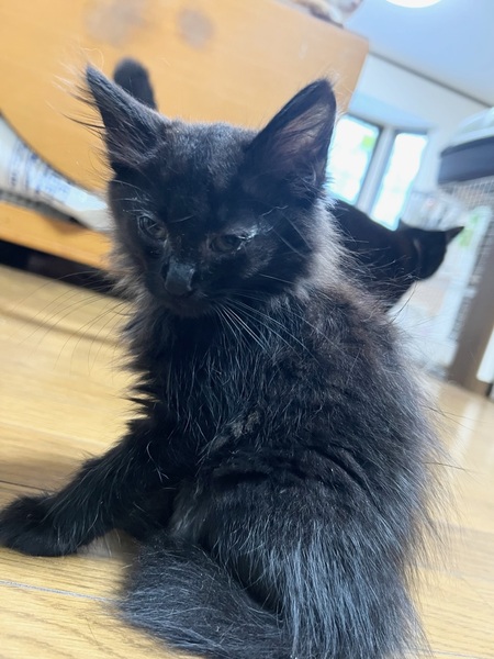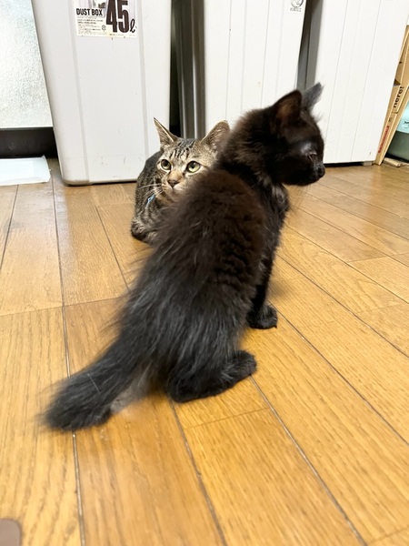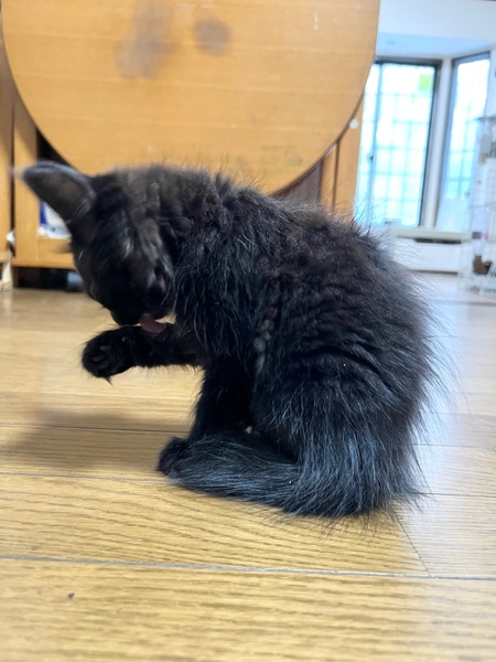 | 特徴(性格など) | ✴︎ブラック ✴︎長毛 ✴︎雑種 ✴︎メス ✴︎ご飯大好きな女の子 ご飯の音がすると兄妹の中で1番大きな可愛い鳴き声で鳴いてダッシュできます! 遊ぶのも寝るのも食べるのも大好きです。 母猫に似て珍しい黒色の長毛ちゃんです。 成猫の先住猫とも仲良く過ごし、猫慣れしています。住んでいる人も多いので人に怯えることはないと思います。 兄妹たちと毎日楽しく遊んでます。 ご飯の入ってる瓶を振って音を鳴らすとダッシュで来ます(^^) |