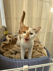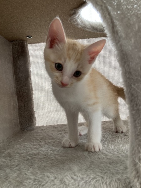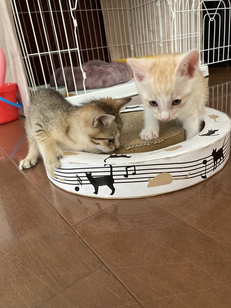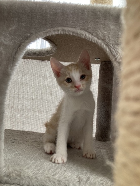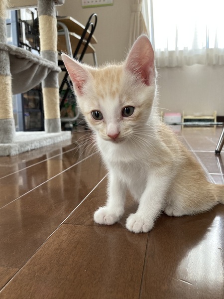 | 特徴(性格など) | 茶白 全体的に薄めの茶白です。 人懐っこい。 子猫特有のキトンブルーの瞳。 食欲もあり元気いっぱい。 キャットタワーも登れました。 |