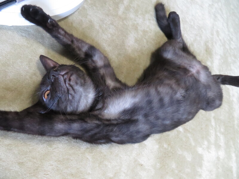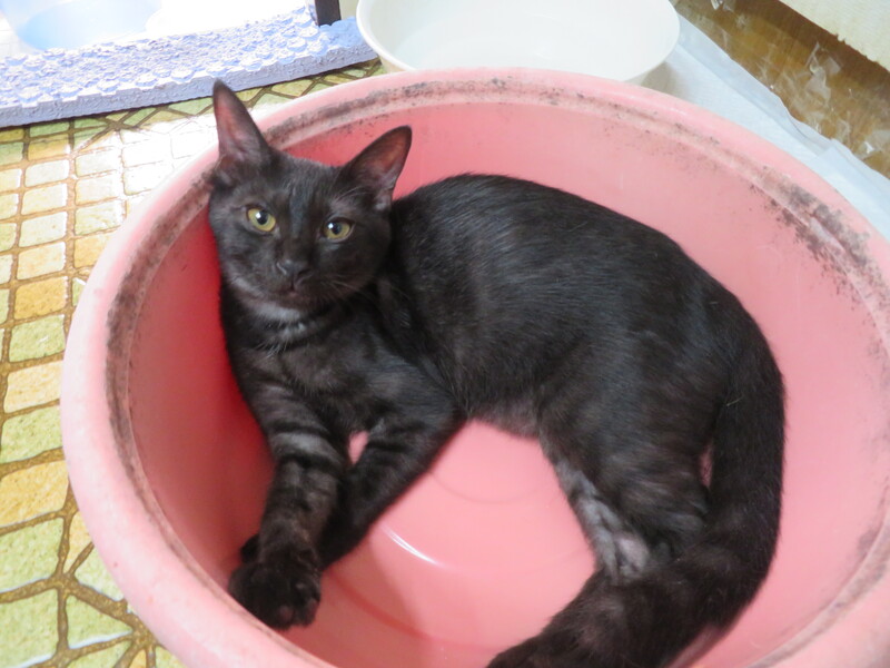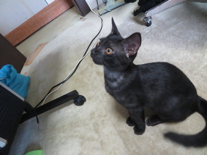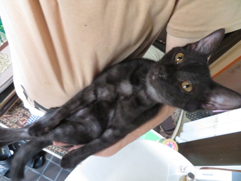 | 特徴(性格など) | 生後数日からミルクで育てているので人によく馴れています。初めて見る人も恐がりません。椅子に座っていると膝に飛び乗ってきて、抱くとすぐにゴロゴロいいます。人に抱かれるのが好きです。他の保護ネコや大人のネコとも仲良く遊びます。元気で活発に動き回り好奇心旺盛で部屋中を探検します。猫じゃらしや玩具で遊ぶのが好きです。珍しい黒トラです。毛の色は黒ですが、うっすらとグレーの縞模様があります。触るとふわふわつるつるしています。尻尾の先っぽが触ったら気づく程度に少し曲がっています。 | ||