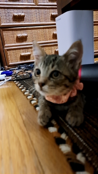 | 特徴(性格など) | 750g→900g 人に対してやや恐怖心ある表情もありますがゲージからでると、元気いっぱい。おもちゃで元気に遊んだり、無邪気に甘えてくる様子もあり。 (体重は保護した翌日の8/3→8/12時点) ◆健康状態 猫風邪の治療中(点眼鼻薬) 現在は、症状ほぼ改善しています。 ノミダニ駆除済 一回目のワクチン接種済(8/12) エイズ等の血液検査はまだ行っていません。 |