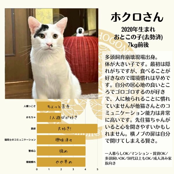| 特徴(性格など) | 体は大きめの男の子ですが性格はシャイ。ご飯やおやつなど食べる事が好きです! 今のところおもちゃにはあまり興味が無く人に対しての警戒心が強めですが、猫同志のコミュニケーション能力は高く、環境や他猫ちゃんには比較的早く慣れてくれます。 【好きなこと】 ご飯やおやつなど食べること 先住猫さん達に甘えること 【苦手なこと】 人全般(近づくと逃げてしまいます) 先住猫ちゃんがいるご家庭や、ゆったりとした生活をしていらっしゃるご家庭の里親様お待ちしております。 一人暮らしの方や先住猫がいらっしゃらないご家庭でも募集可能ですのでご連絡ください。 |