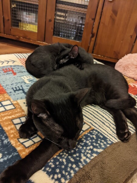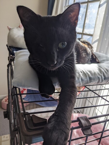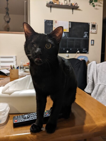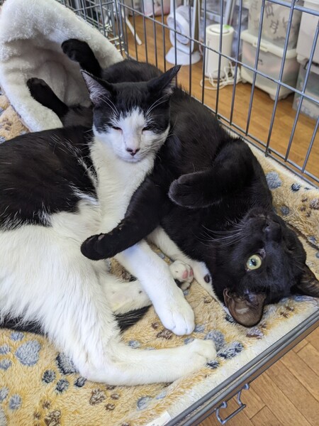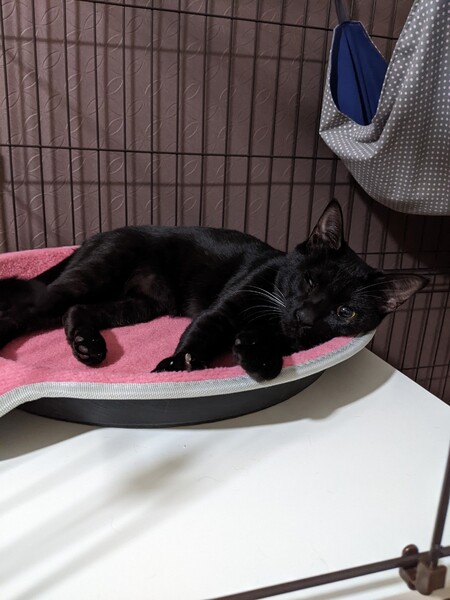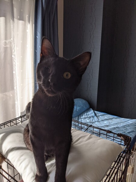 | 特徴(性格など) | 2023.4.20生まれ(推定) 毛色:黒 保護時の猫風邪の影響で片眼を失ってしまいましたが、 そんな事はみじんも感じさせない、愛嬌たっぷりな黒猫の男の子に成長しました。 とにかく、性格がバツグンに良いです。とても穏やかで、甘え上手。 一緒に暮らす保護猫達にも温和に接する事が出来、 小さい子達の良きお兄さん的な存在です。 おもちゃを追いかけてパワフルにジャンプもお手のもの!! 遊ぶの大好き!!相棒猫の『ナル』とは大の仲良し。 一緒にお迎え頂くことも可能ですので、ご相談ください。 |