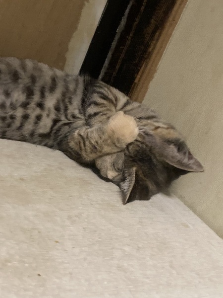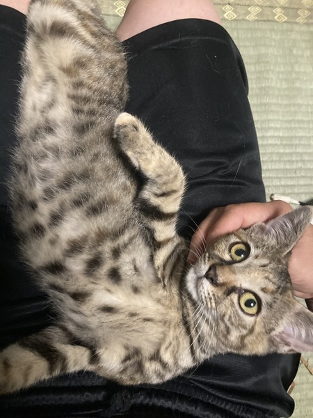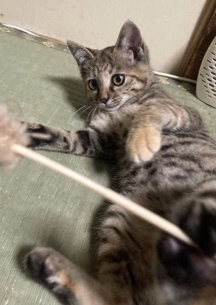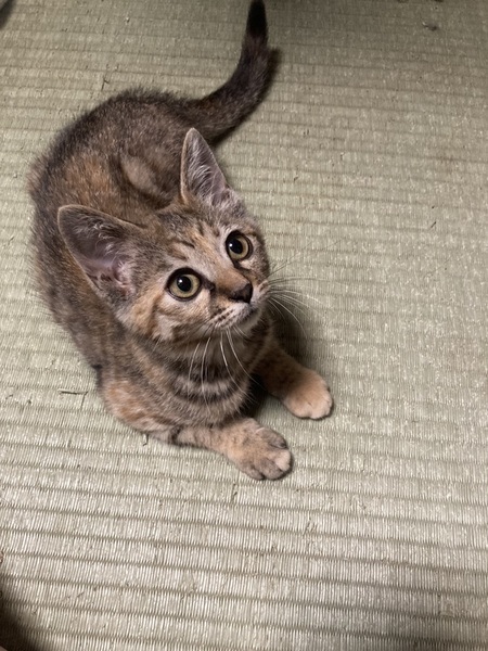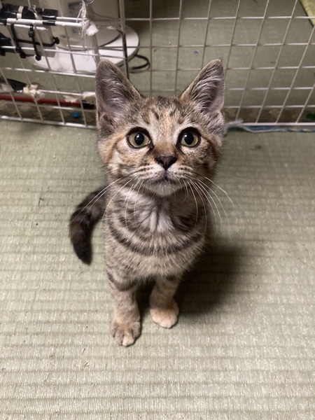 | 特徴(性格など) | はっきりしたしま模様がかわいい、キジトラの猫さんです。とっても甘えん坊で、目が合うだけでゴロゴロ言うまだまだ赤ちゃんな女の子です。 とても元気に遊びますが、あまり鳴かない子です!(今だけかもしれません笑) 性格はかなり穏やかで、社会性も身についています。甘噛みもできます。他の猫ちゃんと仲良くできます。すぐ抱っこもできます。 今は同じ保護猫のお兄ちゃんお姉ちゃんと遊んだりしながら、集団生活にも少しずつ慣れさせているところです。 人馴れについてはバッチリです!保護当日から抱っこできるくらい、人懐っこい子でとても飼いやすいと思います。 |