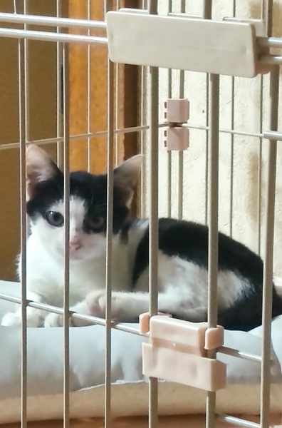 | 特徴(性格など) | 白黒の柄です。 耳先が白く、 肉球とお鼻はピンク色です。 しっぽは、くの字に曲がっています。 |