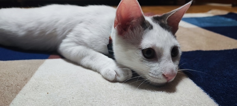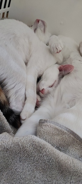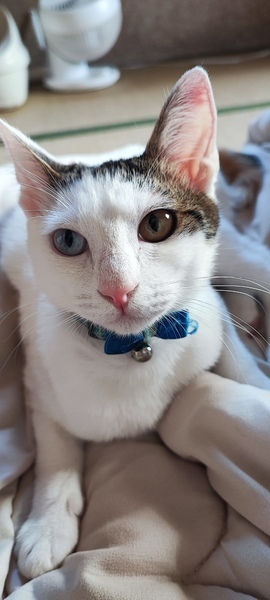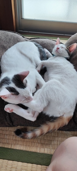 | 特徴(性格など) | 一匹は頭と尻尾がグレー、それ以外は真っ白です。 もう一匹は頭と尻尾が黒と茶色が混ざっていて体は真っ白です。この子は目がオッドアイです。 二匹とも、人間慣れしていて抱っこしても嫌がりません。一緒の布団でも寝ます。 |
