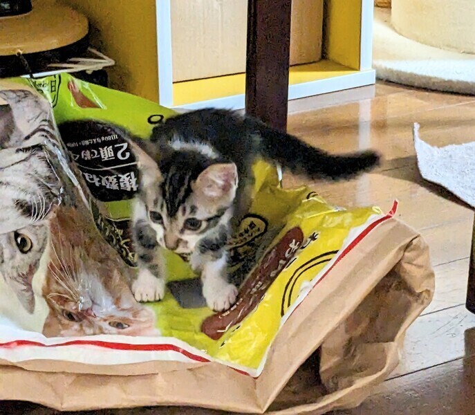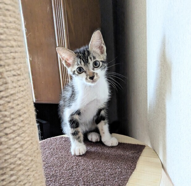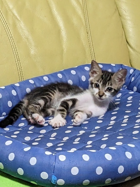 | 特徴(性格など) | はずかしがりやですが、じゃれ棒で遊ぶのは大好きです キャットポールも1番上まで登れるおてんばさんです♪ 成猫達にもスリスリ甘えて行き、可愛がられています どろぼうひげがチャームポイント♡ 体の黒い部分がアメショーみたいに渦巻き柄になっていて珍しいです |