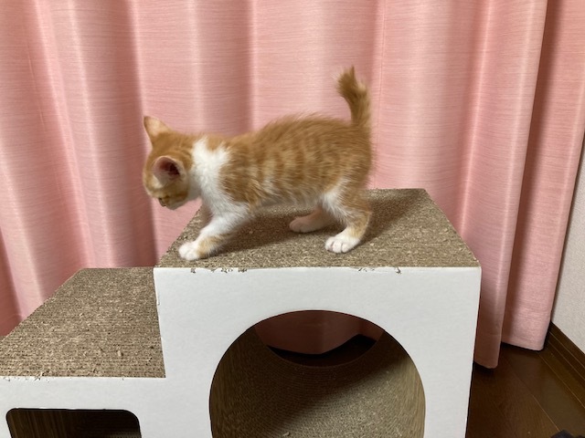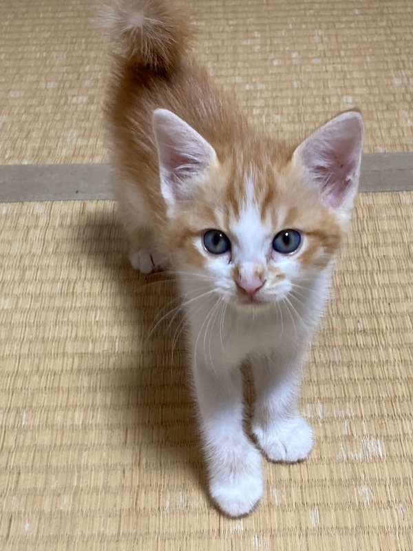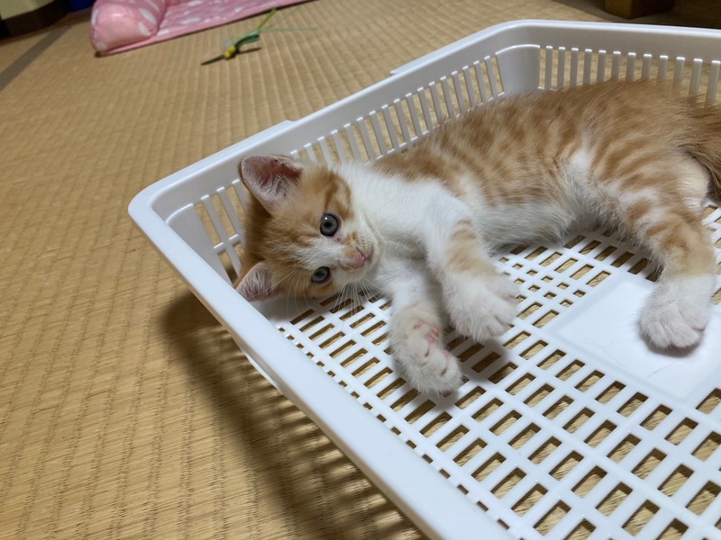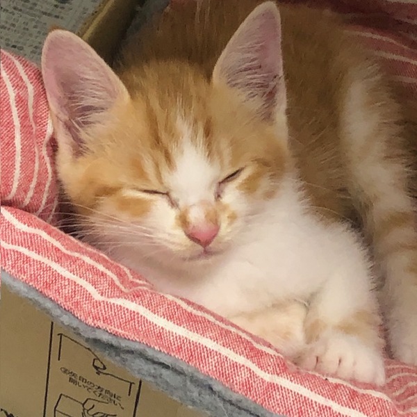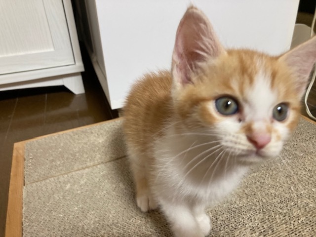 | 特徴(性格など) | 活発で元気いっぱいな珍しい茶白の女の子です。 8月27日現在体重700グラム、 よく食べよく遊びとても元気です。 エイズ・白血病検査は共に陰性です。 便の検査も異常なしでした。 初めてのおもちゃや初めての人にはちょっとビビリが発動しますが、 すぐに慣れて遊び始めます。 今はティッシュを丸めて作ったボールがお気に入りで 飽きずにずっと追いかけています。 可愛い鳴き声でごはんを催促することも覚えてきました。 |