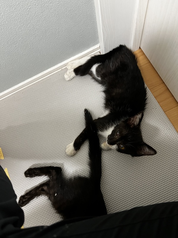 | 特徴(性格など) | 黒と黒白の兄弟です。 黒白の子は今の所オスかな?と病院の先生に言われました。 大きさ的に2ヶ月〜2ヶ月半みたいです。 とっても人懐っこいです。 |