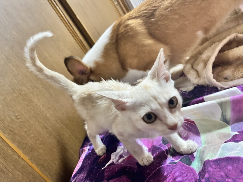 | 里親募集する理由 | 3週間ほど前から突然家へ遊びにくるようになりました。最初は黒子猫と一緒に来てたのですが、この子猫のみになりガリガリに痩せていたし、近頃35度以上の真夏日が連日続き、夜泣きも凄かったので一時保護の名目で保護いたしました。 愛媛県では殺処分がワースト入りしているので愛護センター引渡しが嫌で個人で里親を探そうと。 上記記載により、うちには他にも保護犬や、保護ウサギが多数おり部屋数も少ないため猫の為にはならないと思い募集する羽目になりました。 |