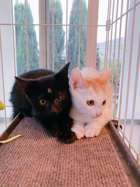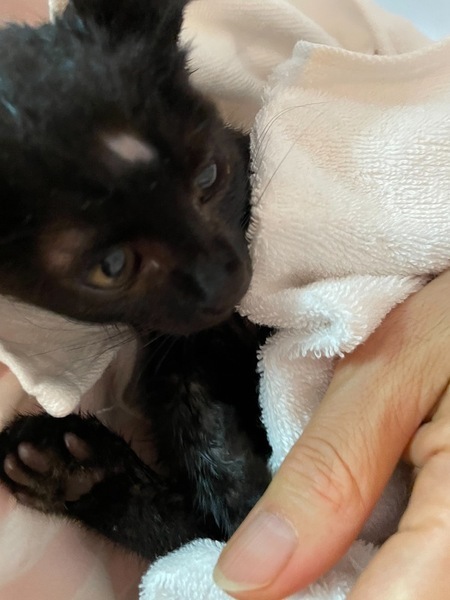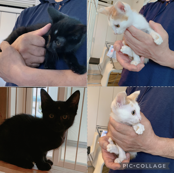 | 特徴(性格など) | *8月29日捕獲器にて保護しました。 *8月30日 大人しくシャンプーさせてくれました。 顔・耳拭かせてくれました。 威嚇や引っ掻いたりせず大人しく良い子にしてます。 *動物病院にて検査 ウィルス検査 HIV 白血病 陰性 兄弟猫で、大人しく可愛いです。 保護2日目ですが、人慣れしてきています。 *カリカリ・チュール食べれます。 *おトイレも失敗なく出来てました。 ◆健康状態 *8月30日動物病院にて検査・健康診断しました。 ウィルス検査 HIV 白血病 陰性 5種ワクチン済み 体重1キロ未満ですので生後45〜50日位 ◇黒猫 オス 950g 結膜炎の為引っ掻いてしまいます(写真3枚目)治療中ですので、治れば引っ掻かないでしょうと、動物病院の先生診断です。 しっぽは幸運の鍵しっぽ 目の色金色です ◇茶白 オス 850g 目の色金色です 兄弟健康状態良好です |