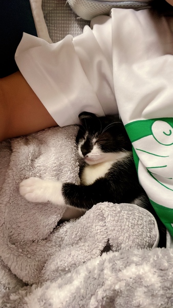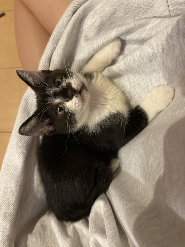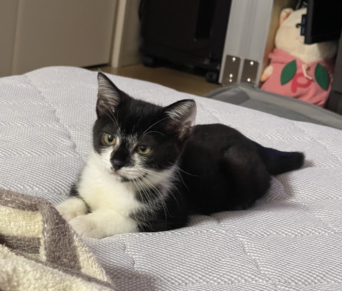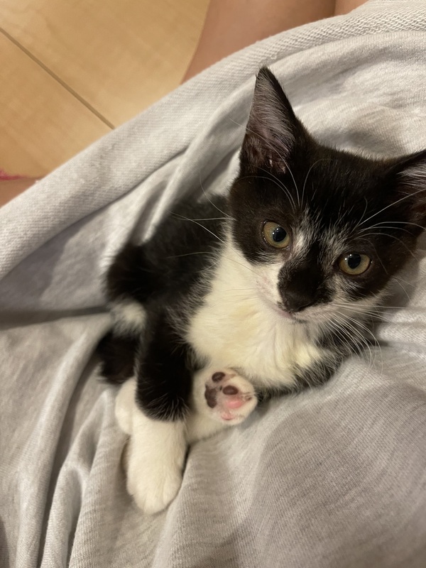 | 特徴(性格など) | 白黒。とっても元気で甘えん坊!呼ぶと走ってきたり、おもちゃを加えて持って来ます。折りたたみのケージ付き!! 動物病院に行ってきました。猫風邪完治。ノミダニ駆除済み。 猫エイズ、白血病 陰性でした! 1回目接種済み 最初はシャーと威嚇していましたが、今はゴロゴロと撫でて〜と近寄ってきて人懐っこいです。病院では大人しく、注射も頑張りました! |