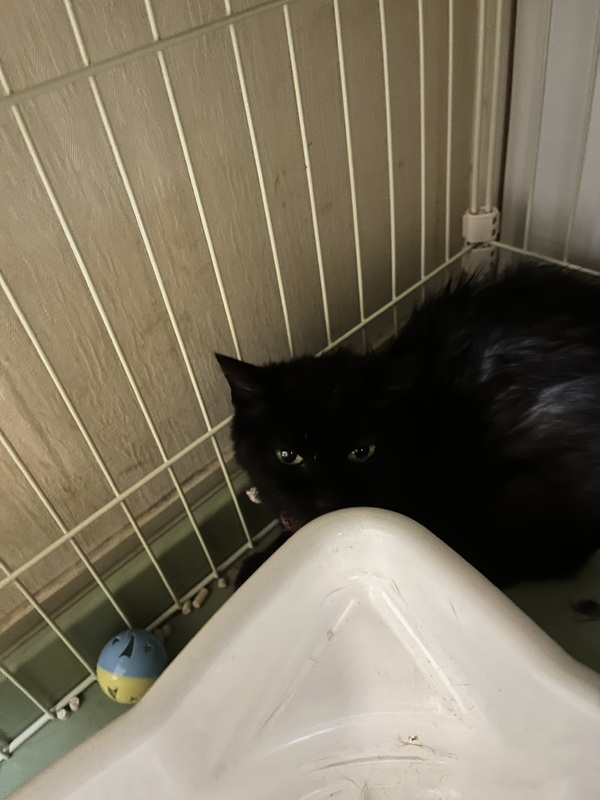 | 特徴(性格など) | 真っ黒な短毛の黒ちゃんです。前歯がありませんがきちんとご飯を食べます。臆病ですが温厚で、ご飯の催促やうんちをした時にきちんと鳴いてお知らせしてくれる子です。他の猫が怖いようなので、1匹での飼育をオススメします。 | ||